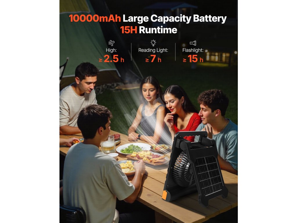 Tento solární ventilátor je navržen pro venkovní dobrodružství a nabízí dlouhou výdrž baterie, několik nastavení rychlosti pro rychlé chlazení a tichý provoz pro klidný zážitek. Podporuje reverzní nabíjení a obsahuje LED světlo. Ideální pro kempování, rybaření, pikniky a další akce!