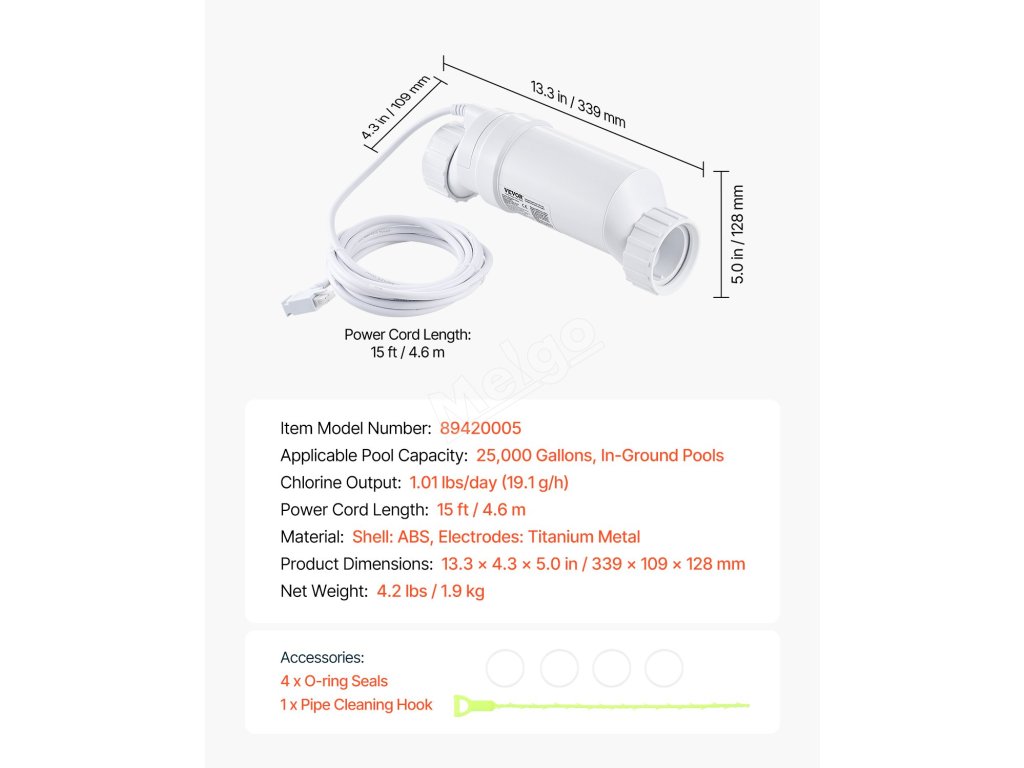 Tento systém chlorování solí je vhodný pro nadzemní bazény do 25 000 galonů, je kompatibilní se systémy, jako je Hayward W3T-Cell-9 (T9), a nabízí účinné čištění vody.