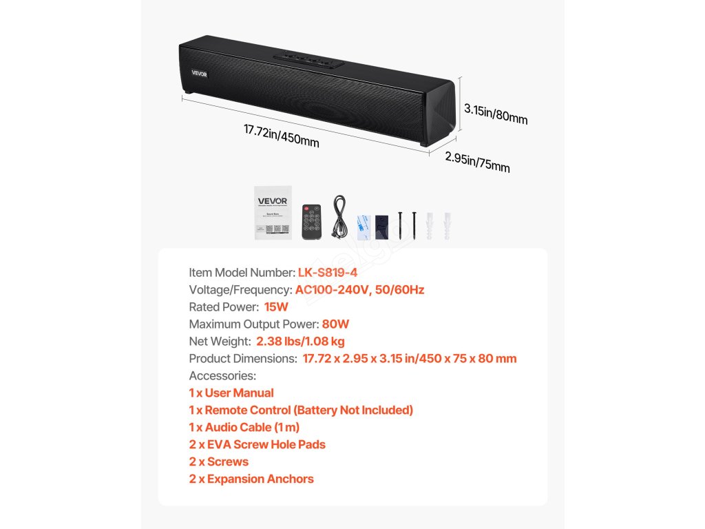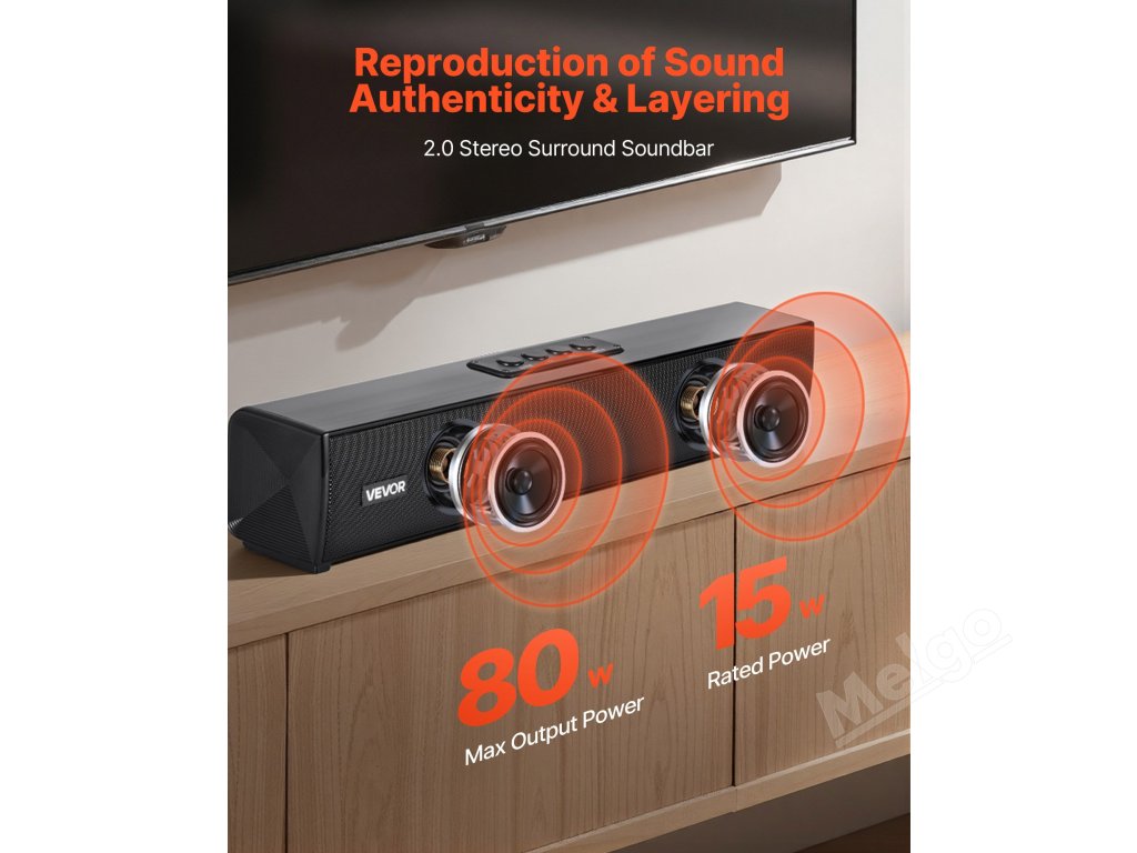 80W soundbar 2.0 pro TV má levý a pravý kanál v provedení, které poskytuje silné basy a vysokou hlasitost. Dokáže bezproblémově zprostředkovat od šokujících filmových efektů až po hluboké basy hudebních efektů a zároveň poskytuje jasnou a vysokou hlasitost pro skvělý zážitek z poslechu.