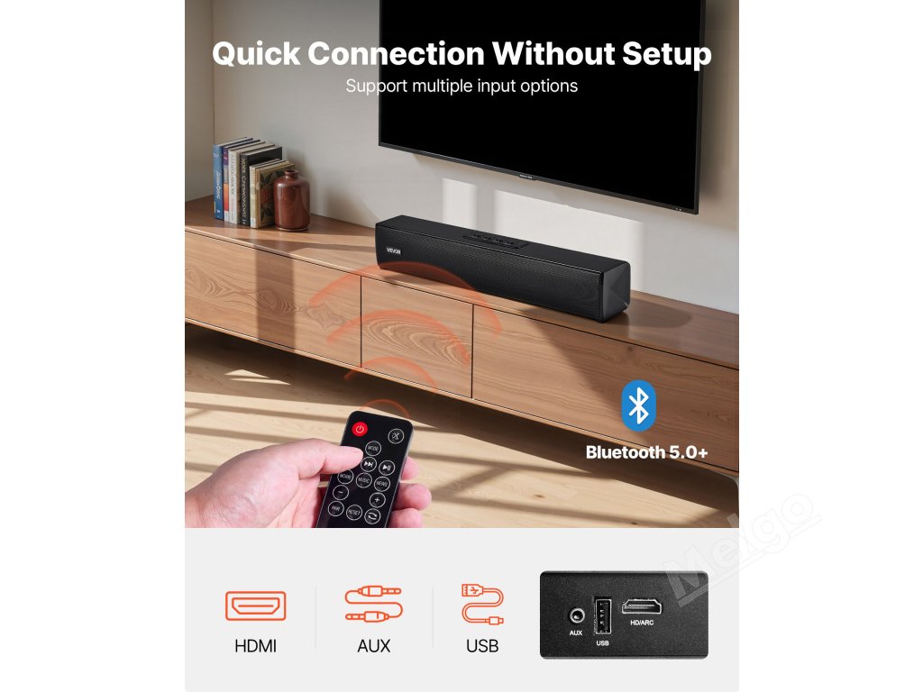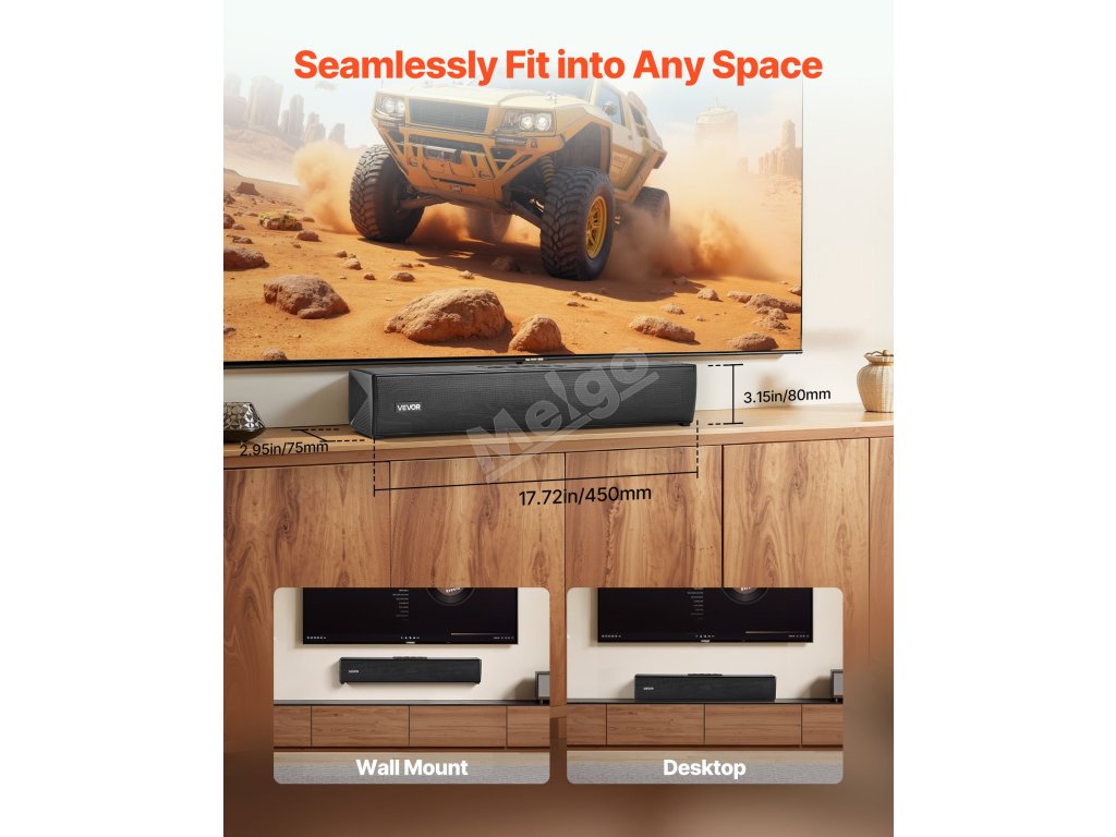 Soundbar Bluetooth nabízí více možností instalace, lze jej umístit na stůl i na stěnu a přizpůsobit tak prostoru. Ať už je namontován na stěně nebo umístěn na televizním stojanu, elegantně zapadne do vašeho interiéru, ušetří místo a zároveň vylepší vzhled místnosti.