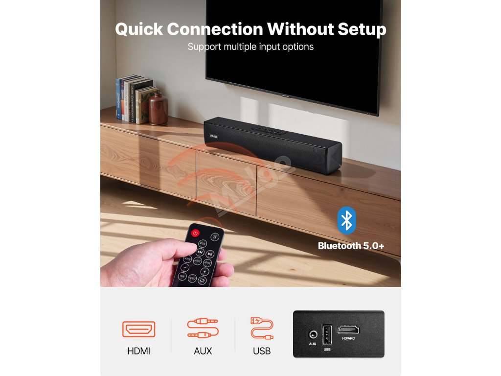 Tento televizní soundbar podporuje bezdrátové připojení Bluetooth 5.0 a kabelová připojení včetně HDMI, AUX a USB. Bezproblémově se připojuje k telefonům, televizorům, tabletům, počítačům a projektorům, aby splnil vaše zvukové potřeby v různých scénářích bez omezení zařízení.