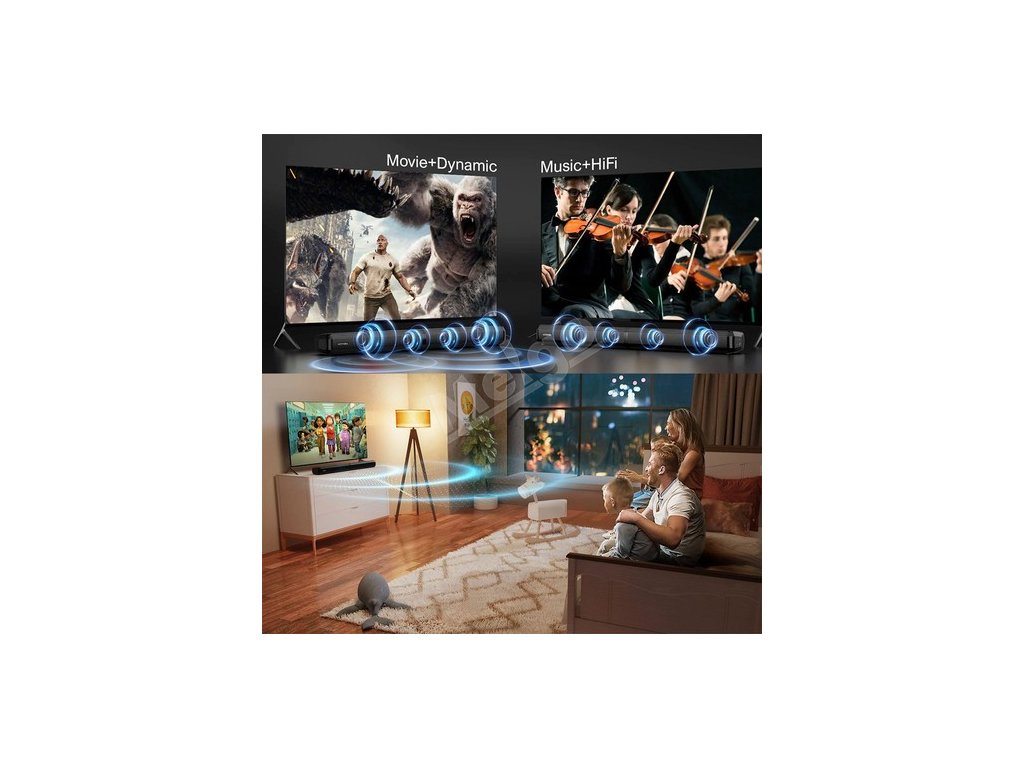 Duální kabelové + bezdrátové připojení: soundbar je vybaven porty ARC, optickým, AUX a USB (všechny kabely jsou součástí balení) pro rychlé a snadné připojení k zařízení, zatímco Bluetooth 5.0 poskytuje vyšší rychlost a dosah až 50 metrů.