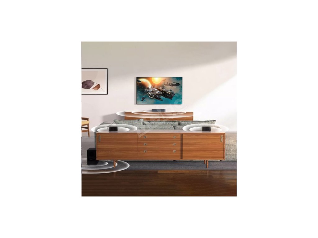 Tento 5.1-kanálový soundbar pre televízor je vybavený 2 zadnými reproduktormi a 1 subwooferom, ktoré vám prinášajú filmový zážitok s naším dekódovaným prehrávacím zariadením. Na pripojenie priestorových reproduktorov k subwooferu sa používa 19,6-metrový kábel, takže priestorové reproduktory môžete umiestniť kamkoľvek vzhľadom na vaše preferencie.