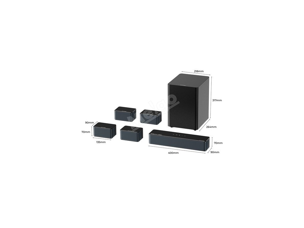 | Obsah balení | 1 x Soundbar 1 x subwoofer 4 x prostorový reproduktor 1 x napájecí adaptér 1 x Napájecí kabel subwooferu 1 x Přední levý surroundový kabel (3 m) 1 x kabel pro přední pravý surround (3 m) 1 x zadní levý surroundový kabel (6 m) 1 x zadní pravý prostorový kabel (6 m) 1 x HDMI kabel 1 x digitální optický kabel 1 x dálkový ovladač 12 x sada pro montáž na stěnu 6 x nástěnný držák 6 x montážní šrouby 1 x návod k použití |