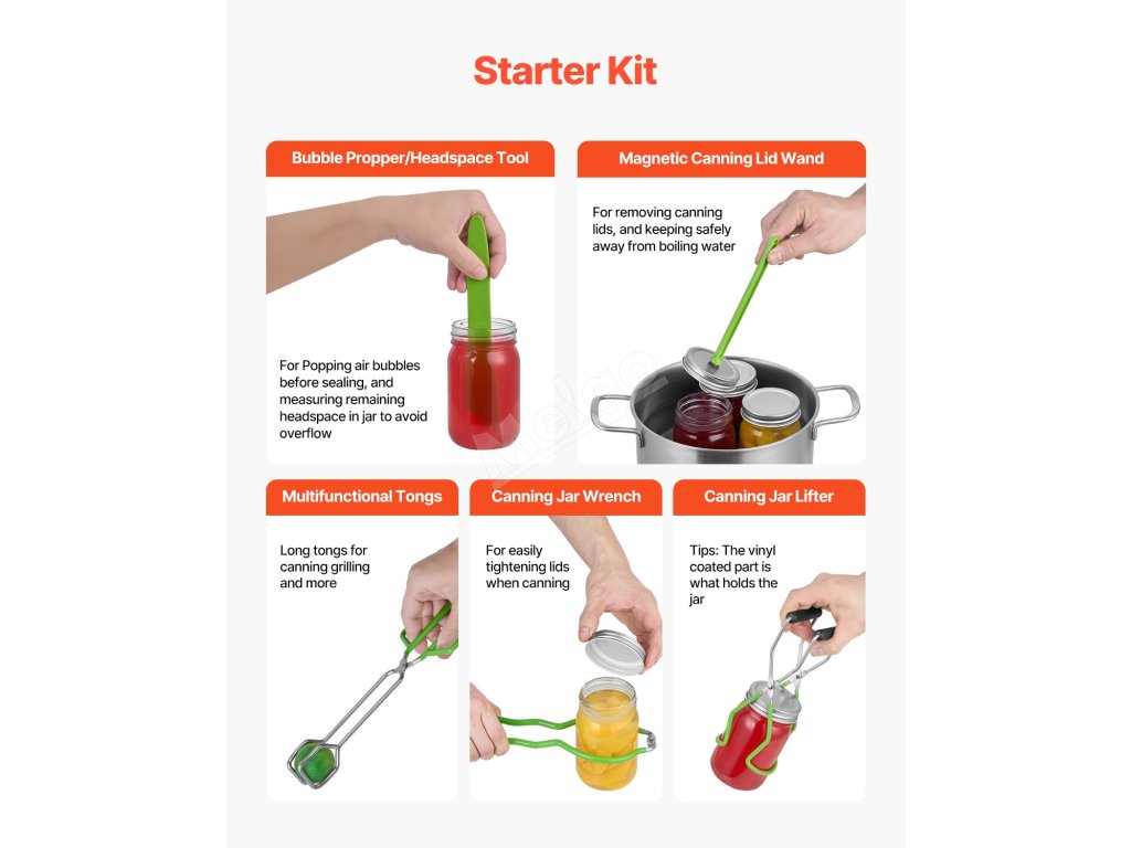 Naše startovací sada potřeb pro zavařování obsahuje kompletní sadu základních nástrojů, jako je klíč na zavařovací sklenice, zvedák na sklenice a další praktické věci, které uspokojí všechny vaše potřeby při domácím zavařování. Startovací sada je ideální pro začátečníky i zkušené domácí kuchaře.