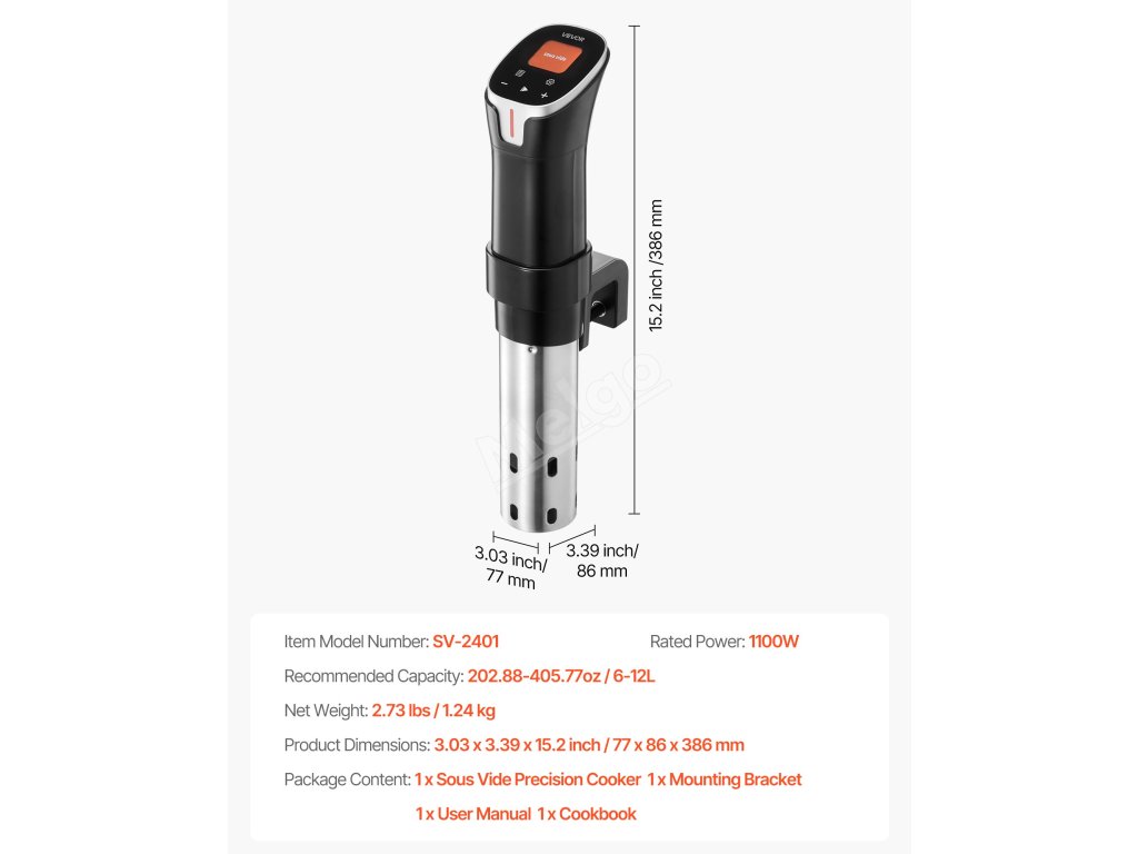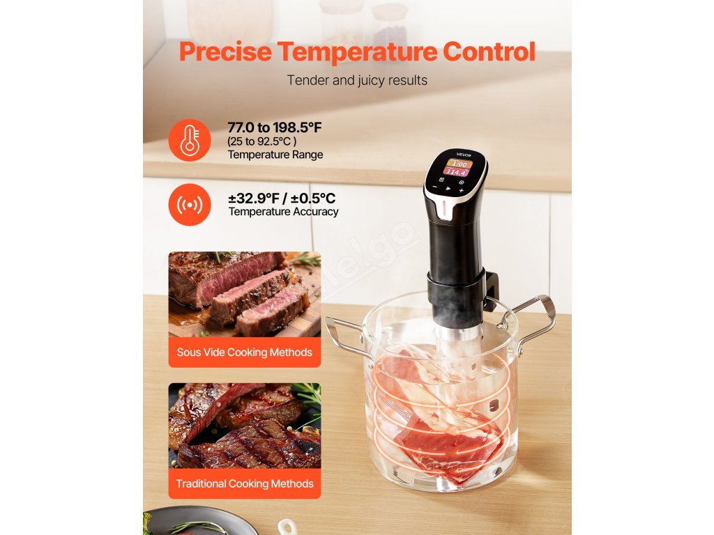 Přístroj na vaření sous-vide nabízí přesnou regulaci teploty v rozsahu od 25 °C do 92,5 °C (77,0 °F až 198,5 °F) s přesností ±0,1 °C. Nastavte dobu vaření od 1 minuty do 99 hodin a 59 minut, což vám umožní uvařit jakoukoli surovinu a zachovat její křehkost a chuť.