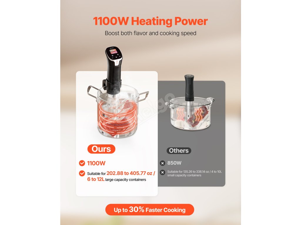 Ponorné oběhové čerpadlo o příkonu 1100 W se spirálovou cirkulací 3000 otáček za minutu rychle a rovnoměrně ohřívá vodu a zajišťuje rovnoměrnou teplotu v nádobách o objemu 6 až 12 l. Silné kusy se vaří rovnoměrně uvnitř i zvenku, což zkracuje dobu vaření a přináší konzistentní a spolehlivé výsledky.