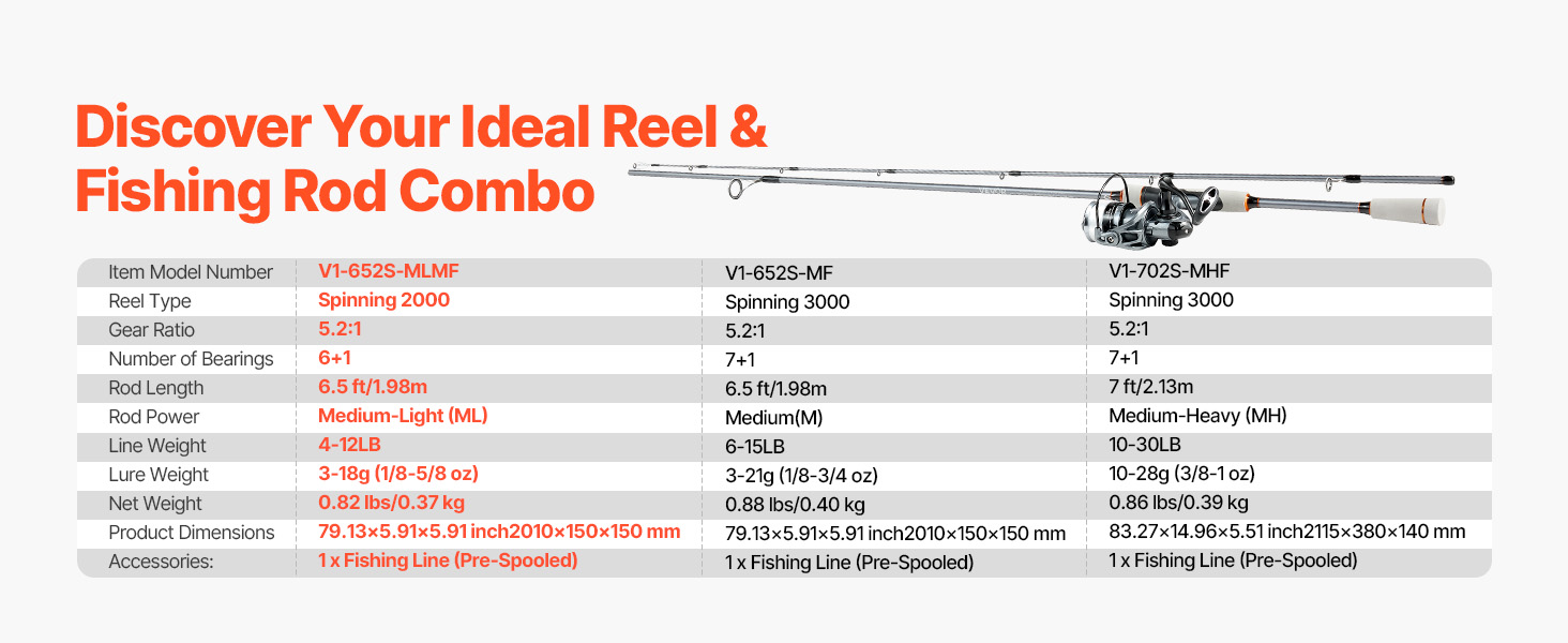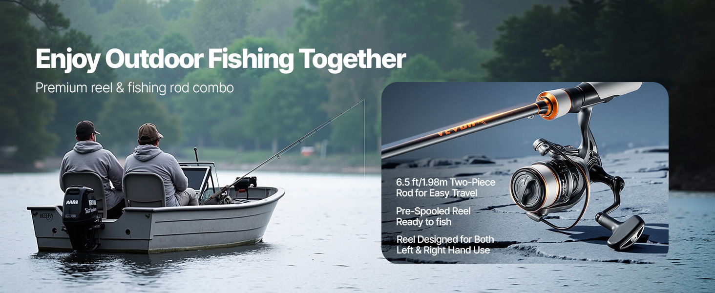 Tento dvoudílný rybářský prut a naviják o délce 6,5 ft/2 m je určen pro začátečníky. Jsou dodávány s navinutým vlascem a mohou je snadno používat jak leváci, tak praváci. Jsou vyrobeny ze skleněných vláken a karbonu, díky čemuž jsou odolné a pohodlné při lovu ve sladké i slané vodě.
