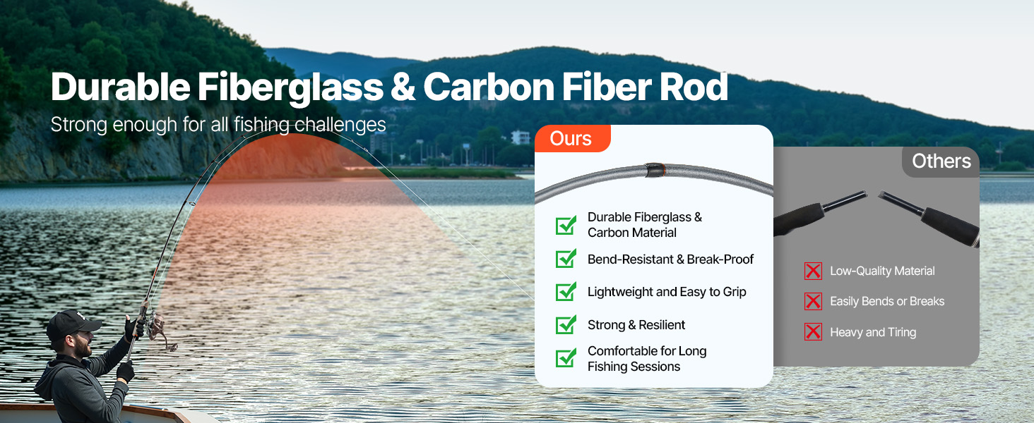 Tento rybářský prut je vyroben z pevných skleněných vláken a uhlíku, poskytuje vynikající odolnost proti ohybu a je méně náchylný ke zlomení. Jeho lehká konstrukce zajišťuje pohodlí i při dlouhodobém používání, takže snadno zvládnete silné tahy ryb a užijete si rybaření.