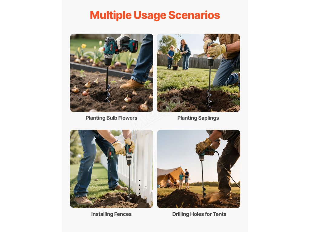 Náš vrták se bez námahy zavrtá do měkké půdy, takže výsadba cibulovin, květin a zeleniny je rychlejší a snadnější. Ideální pro zahradní nadšence, kteří chtějí ušetřit čas a námahu. Tento vrták je také ideální k vrtání otvorů pro instalaci plotů, stanů nebo venkovních dekorací.