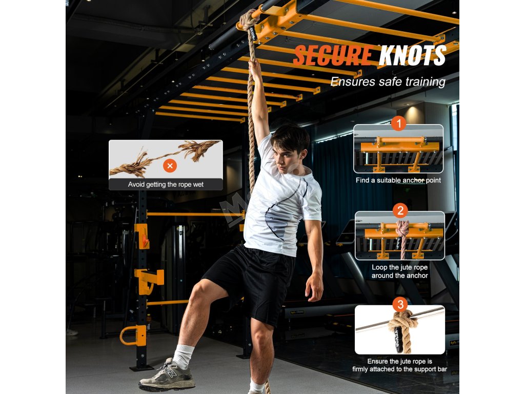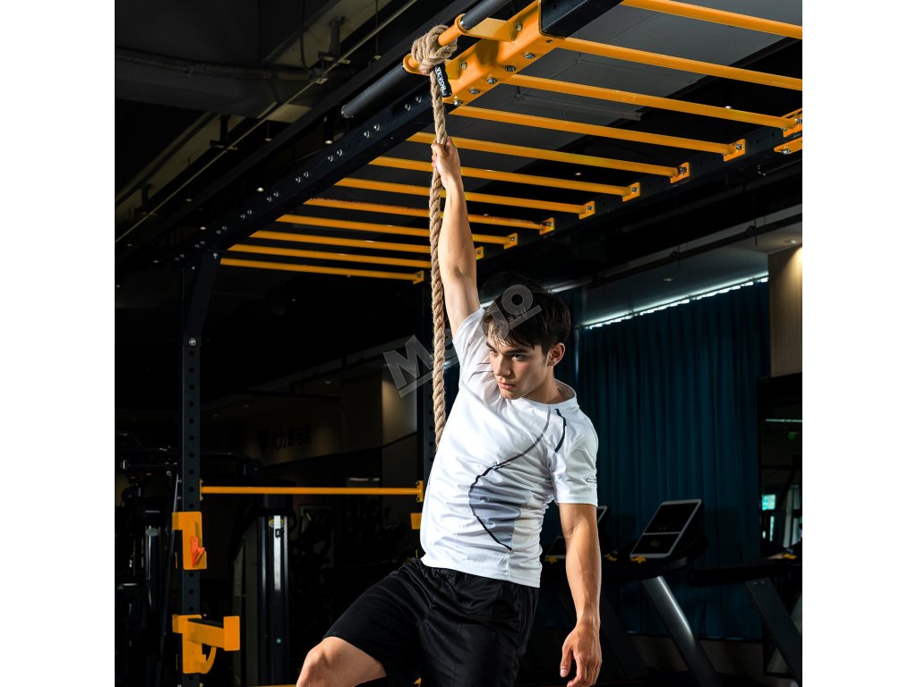 Tréninkové šplhací lano pro silový trénink v posilovně se skládá ze 3 pramenů pevně navinutých s hustou strukturou vláken, které jsou na obou koncích potaženy černými teplem smrštitelnými gumovými návleky. To zajišťuje větší bezpečnost konců lana, odolnost proti opotřebení a uvolnění a poskytuje větší jistotu bezpečnosti při tréninku.