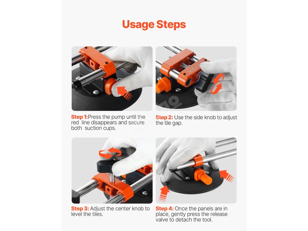 Jednoduše položte regulátor švů na rovnou dlaždici nebo povrch, stiskněte vzduchové čerpadlo, dokud nezmizí červená čára, a poté pomocí bočních knoflíků nastavte mezeru mezi švy. Horní knoflík umožňuje plynulé nastavení výšky, aby bylo zajištěno vyrovnání dlaždice.