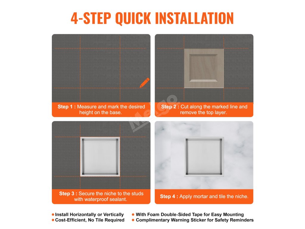 Proces zpevnění povrchu sprchové niky VEVOR, který vede k lepší nosnosti, vhodný pro jakékoliv lepidlo na dlaždice, snadná instalace dlaždic. Zdarma je k dispozici instalační sada pro vodorovnou nebo svislou zapuštěnou instalaci.