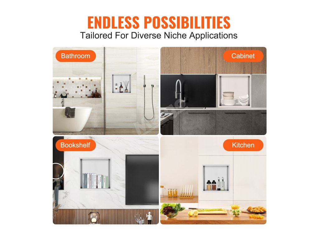 Výklenek lze instalovat vodorovně nebo svisle, což je vhodné zvolit podle uspořádání sprchy a osobních preferencí, aby vyhovoval různým prostorovým potřebám - je umístěn uvnitř stěn, aby se ušetřilo místo v koupelně.