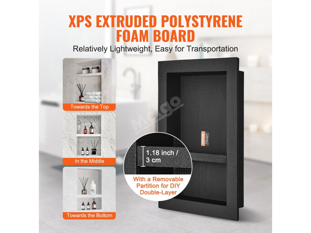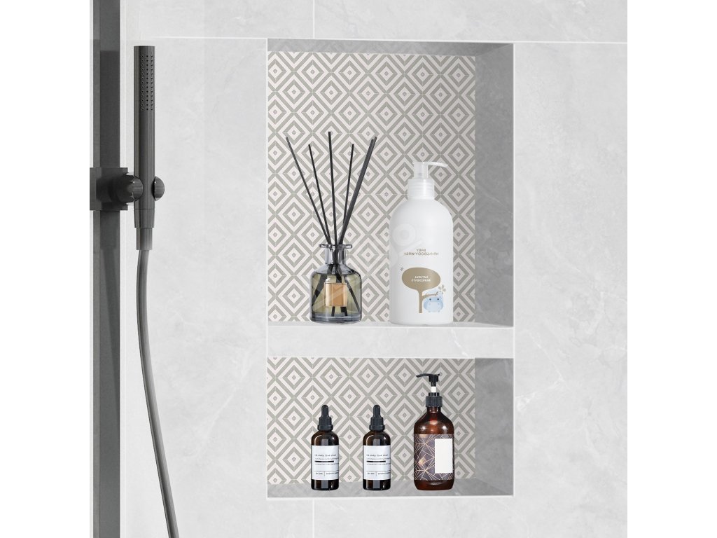 Výklenek lze instalovat vodorovně nebo svisle, což je vhodné zvolit podle uspořádání sprchy a osobních preferencí, aby vyhovoval různým prostorovým potřebám - je umístěn uvnitř stěn, aby se ušetřilo místo v koupelně.