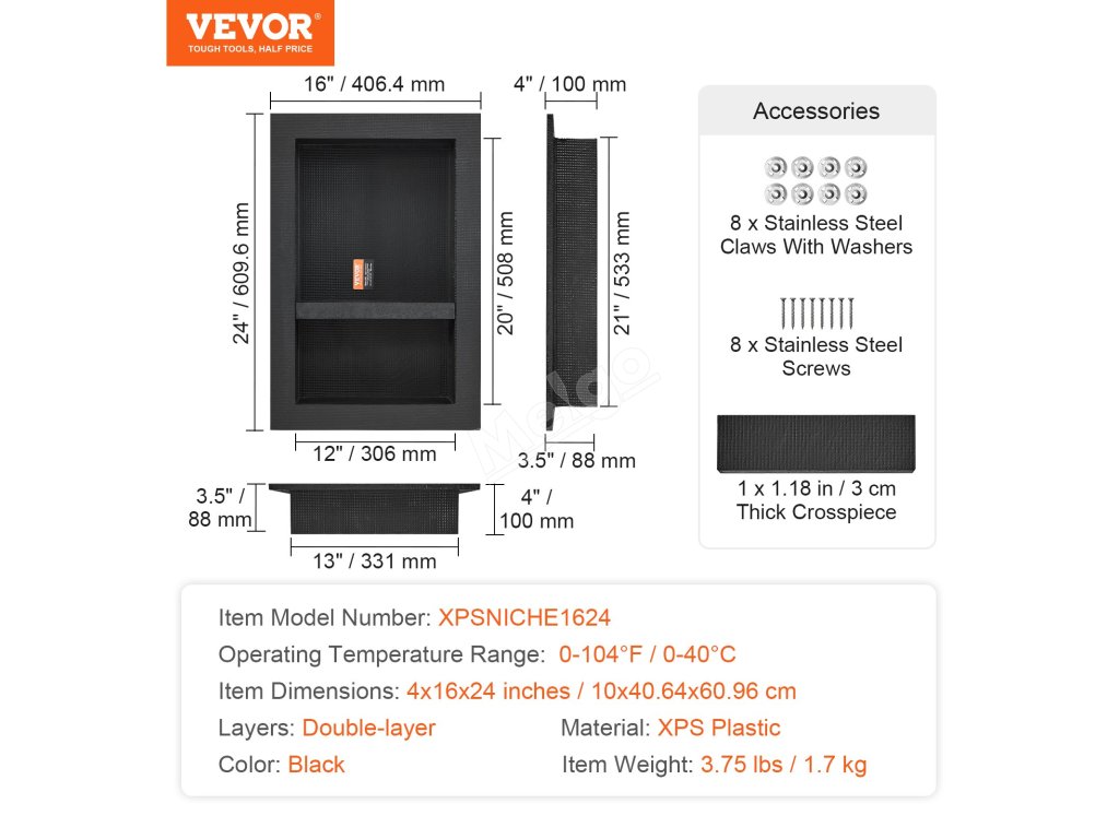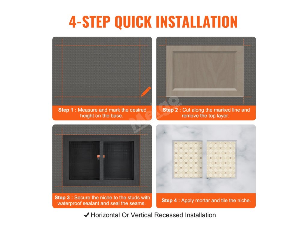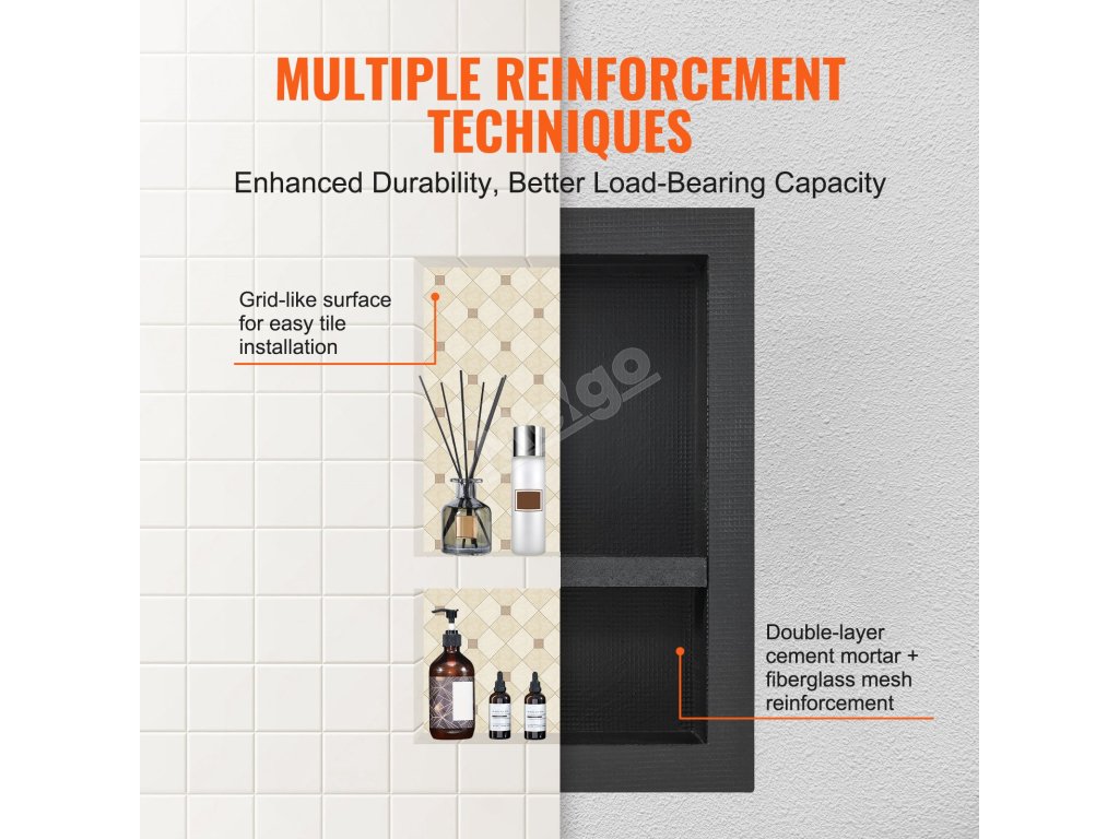 Proces zpevnění povrchu sprchové niky VEVOR, který vede k lepší nosnosti, vhodný pro jakékoliv lepidlo na dlaždice, snadná instalace dlaždic. Zdarma je k dispozici montážní sada pro vodorovnou nebo svislou zapuštěnou instalaci.