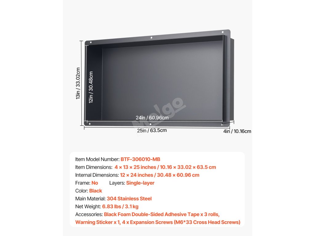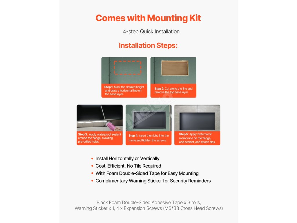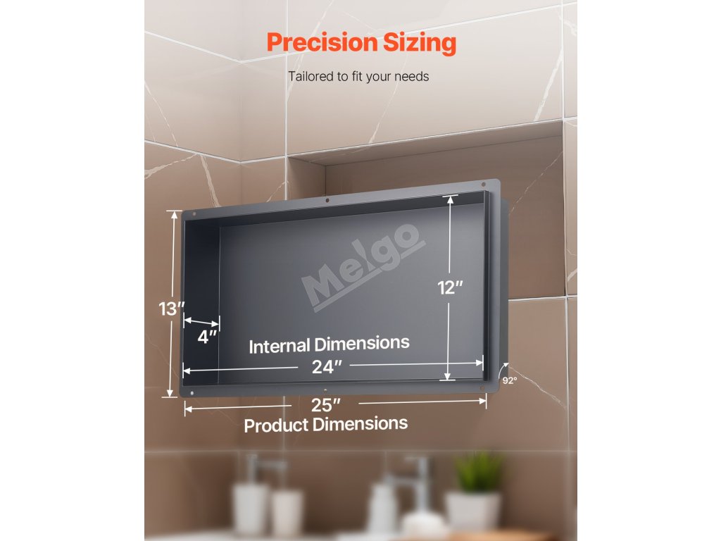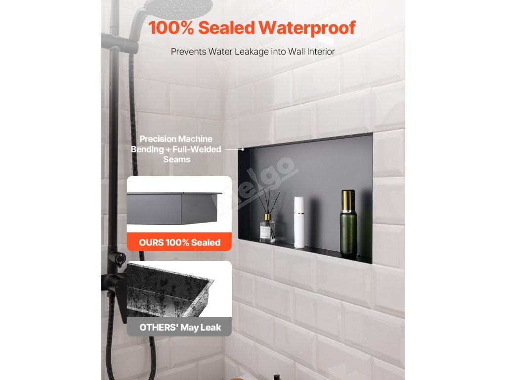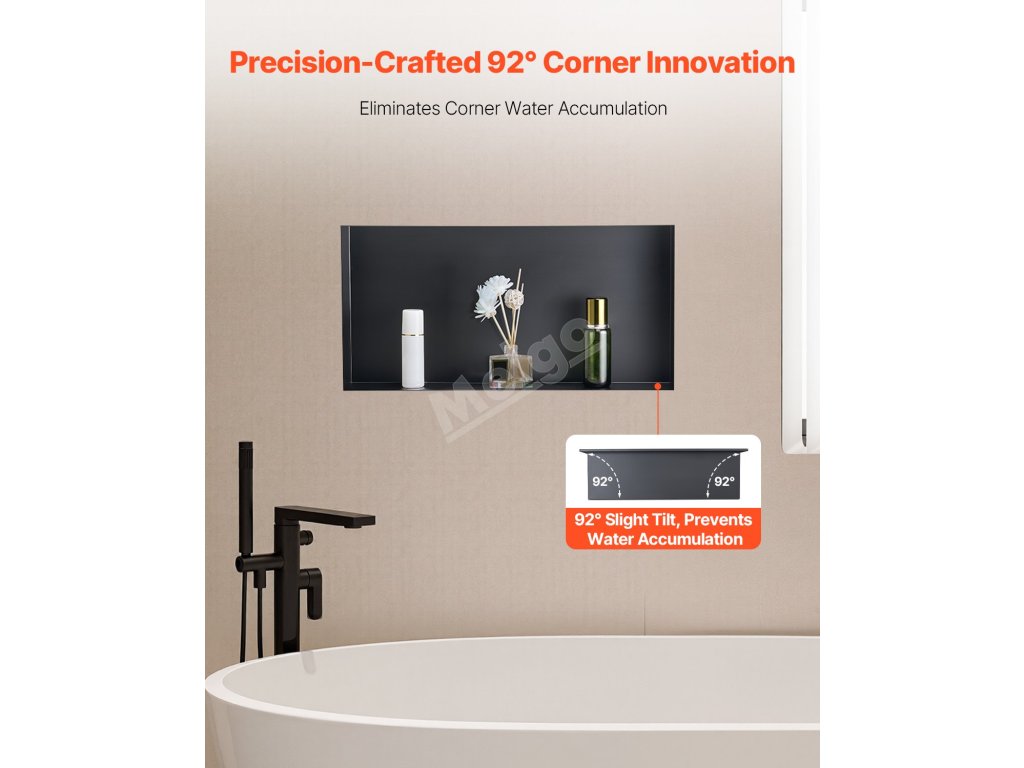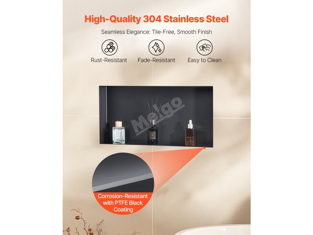 Sprchová nika VEVOR je vyrobena z nerezové oceli 304, je 100% utěsněná a vodotěsná, má povrchovou úpravu odolnou proti korozi, snadno se čistí a je odolná proti poškrábání. Je vybaven předinstalovanou dutou policí, která zabraňuje hromadění vody, ideální do koupelen, šaten a kuchyní.