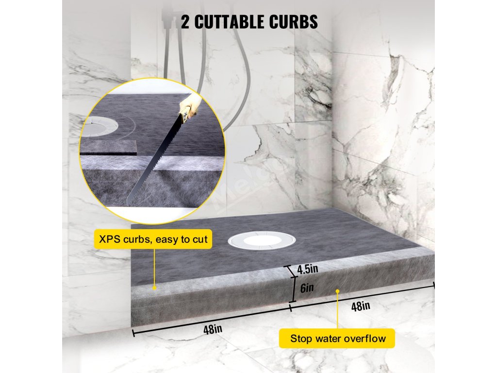 Tyto 2 obrubníky jsou vyrobeny z vysoce stabilního materiálu XPS, který účinně zabraňuje přetékání vody ze sprchové vaničky a zabraňuje vsakování vody do dlažby. Obrubníky se snadno řežou na míru pilovým kotoučem pomocí ploché pily.