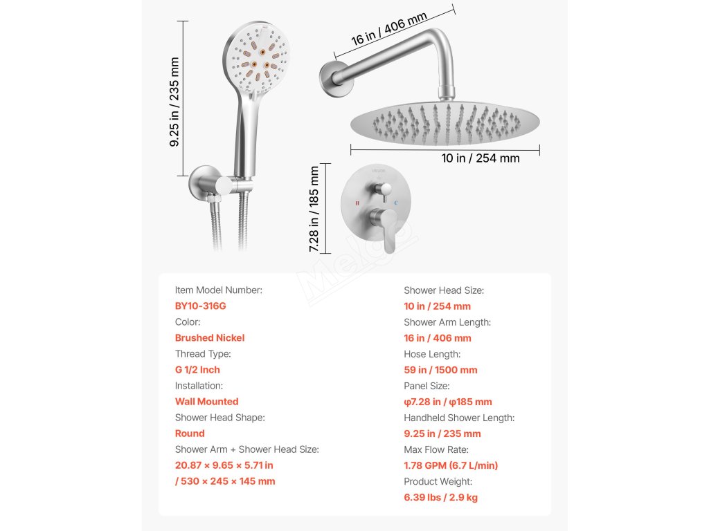 | Veľkosť sprchového ramena + sprchovej hlavice | 20.87 x 9,65 x 5,71 in/530 x 245 x 145 mm |