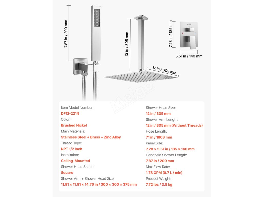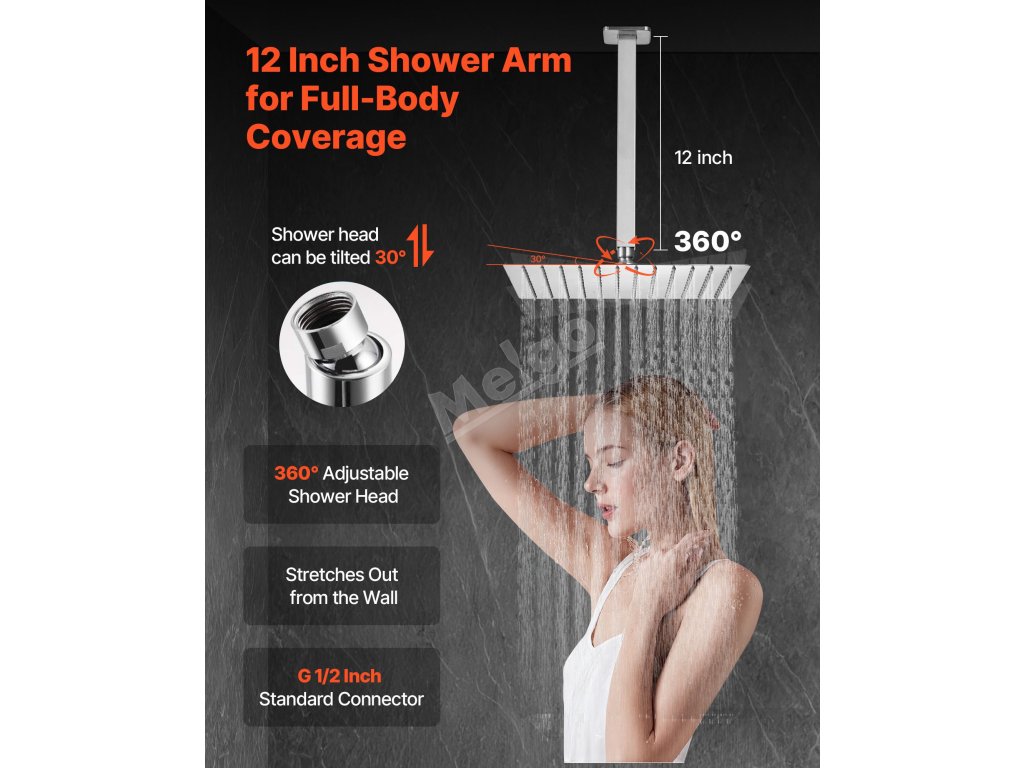 | Veľkosť sprchového ramena + sprchovej hlavice | 11.81 x 11,81 x 14,76 in/300 x 300 x 375 mm |