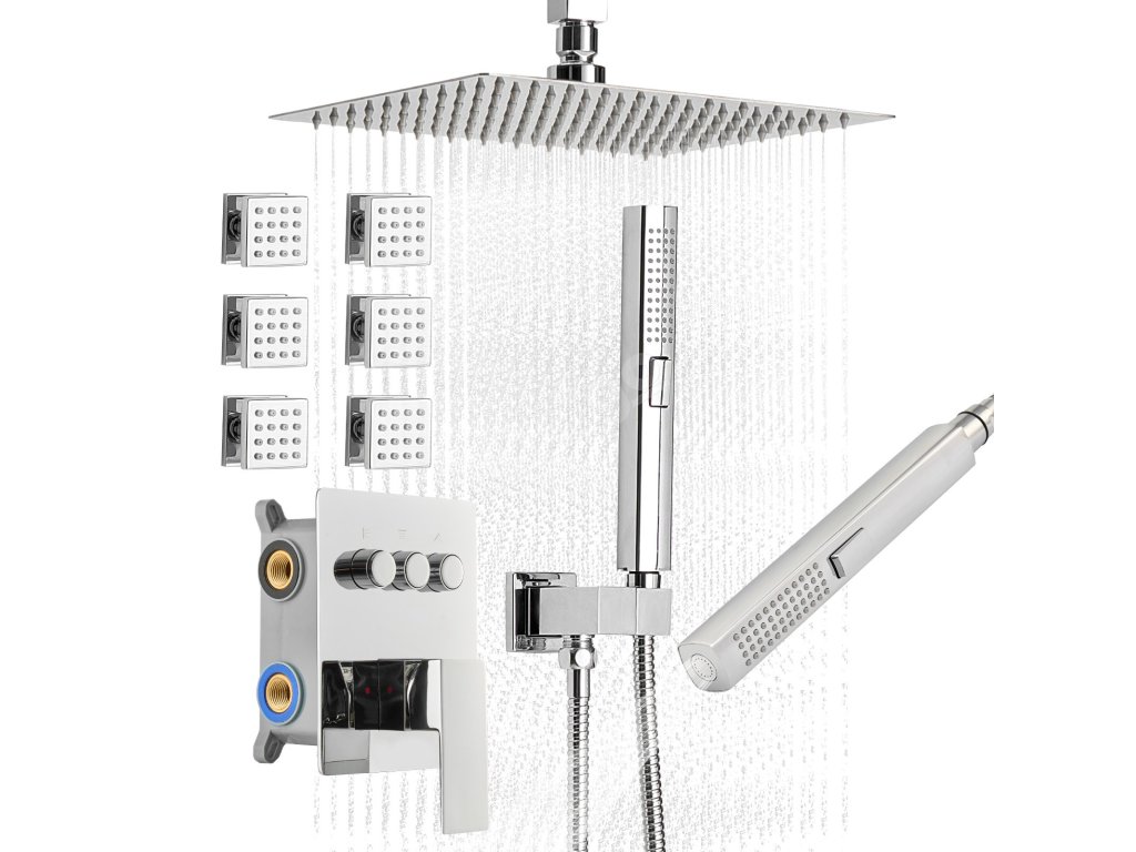 Naše sada sprchové baterie skrývá vodovodní potrubí za stěnou, čímž vytváří elegantní a špičkový vzhled koupelny. Obsahuje 3 osvěžující funkce sprchy - 6 tělových trysek, ruční sprchu a hlavovou sprchu - které umocňují zážitek z celého těla.