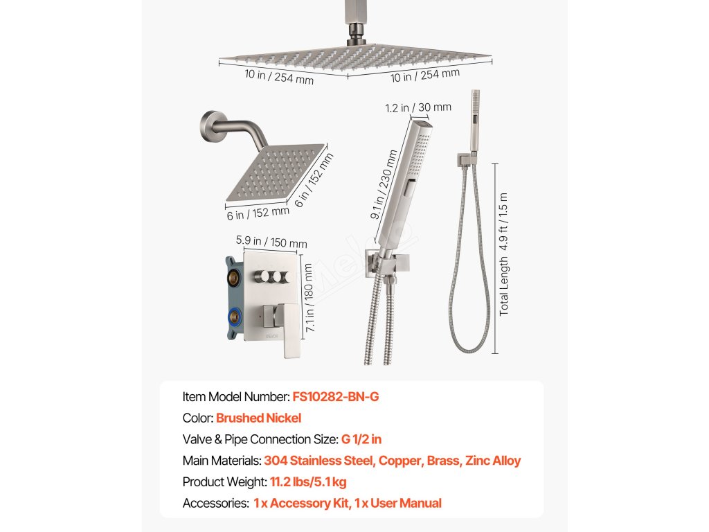 Sprchový set stropní 254 mm, nástěnná 152 mm, 2v1 ruční, broušený nikl