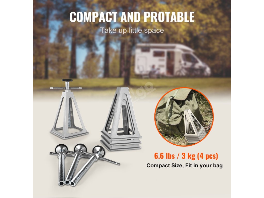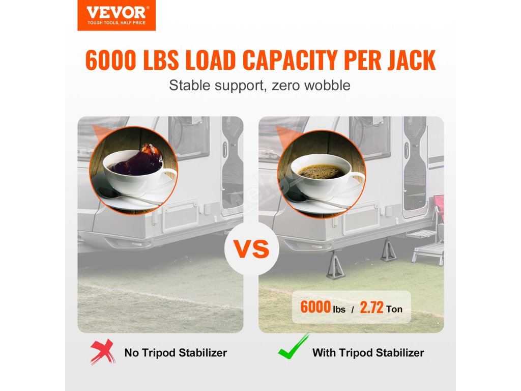 Získejte spolehlivou stabilitu pro svůj obytný vůz s našimi zvedáky stability. Každá sada se dodává se čtyřmi, z nichž každý unese 6000 liber (2,72 t). Trojúhelníková konstrukce udržuje stabilitu, snižuje otřesy a zajišťuje bezpečnost. Užívejte si své aktivity s jistotou!