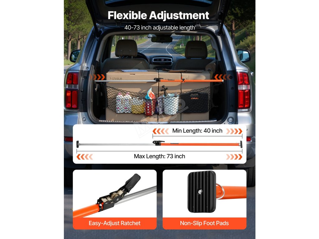 Tato teleskopická nákladní tyč je volně nastavitelná v rozsahu 40 až 73 palců a snadno se přizpůsobí různým typům vozidel. Ať už se jedná o sedan nebo SUV, udrží náklad bezpečně na místě.