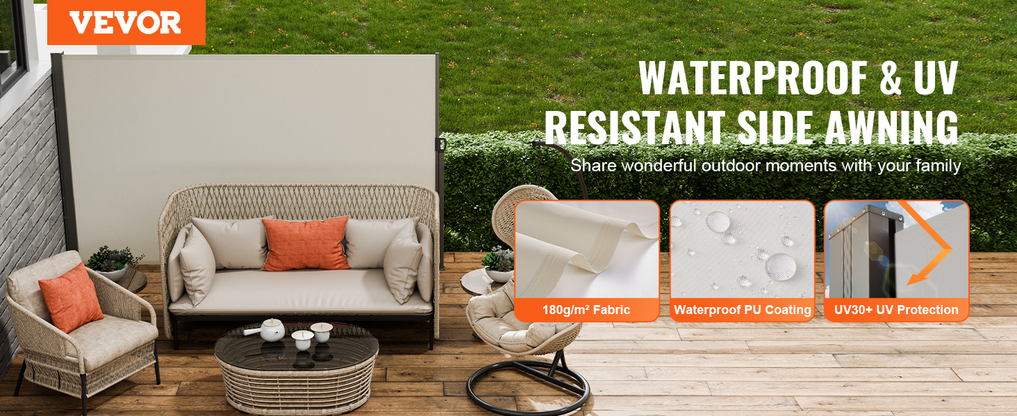 Boční markýza je vyrobena z polyesterové tkaniny o vysoké hustotě 180 g/m² s robustním PU zátěrem, který zajišťuje vynikající nepromokavost a pevnost v tahu. Se stupněm ochrany UV30+ chrání vás i vaši rodinu před UV zářením. Užívejte si pobyt venku bez obav o počasí!