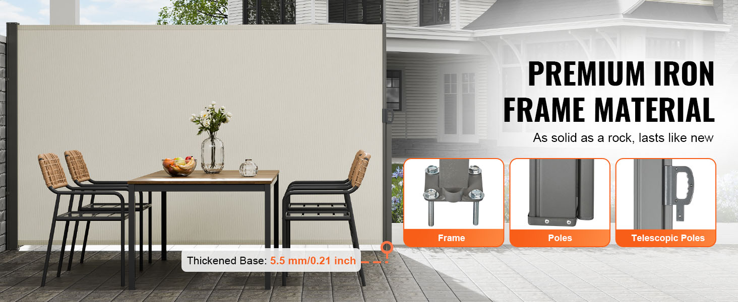 Konstrukce zatahovací zástěny na terasu je vyrobena z vysokopevnostní oceli s práškovým nástřikem pro stylový vzhled a odolnost proti korozi. Kovové rozpěrné šrouby dále zvyšují stabilitu a zajišťují, že zástěna stojí stabilně venku.