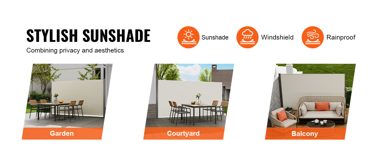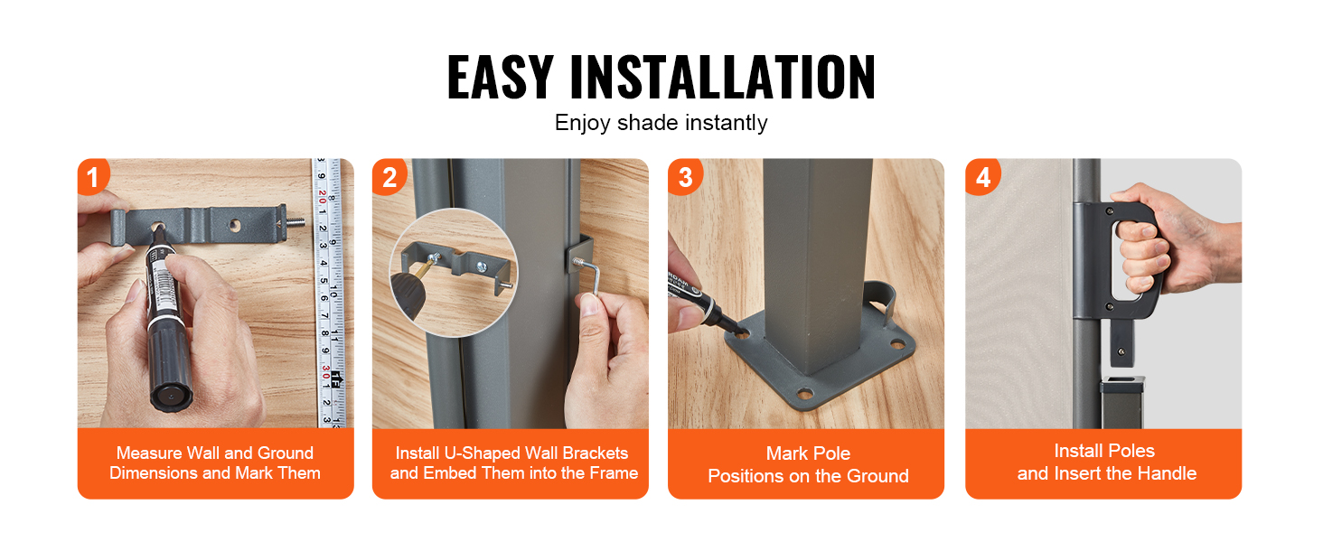 Žádné složité instalační kroky! Naše zatahovací zástěna je navržena s ohledem na pohodlí uživatele. Kompletní sada montážního příslušenství a srozumitelné pokyny umožňují snadnou instalaci, která nevyžaduje žádné odborné znalosti. Vytvořte si rychle příjemný venkovní prostor!