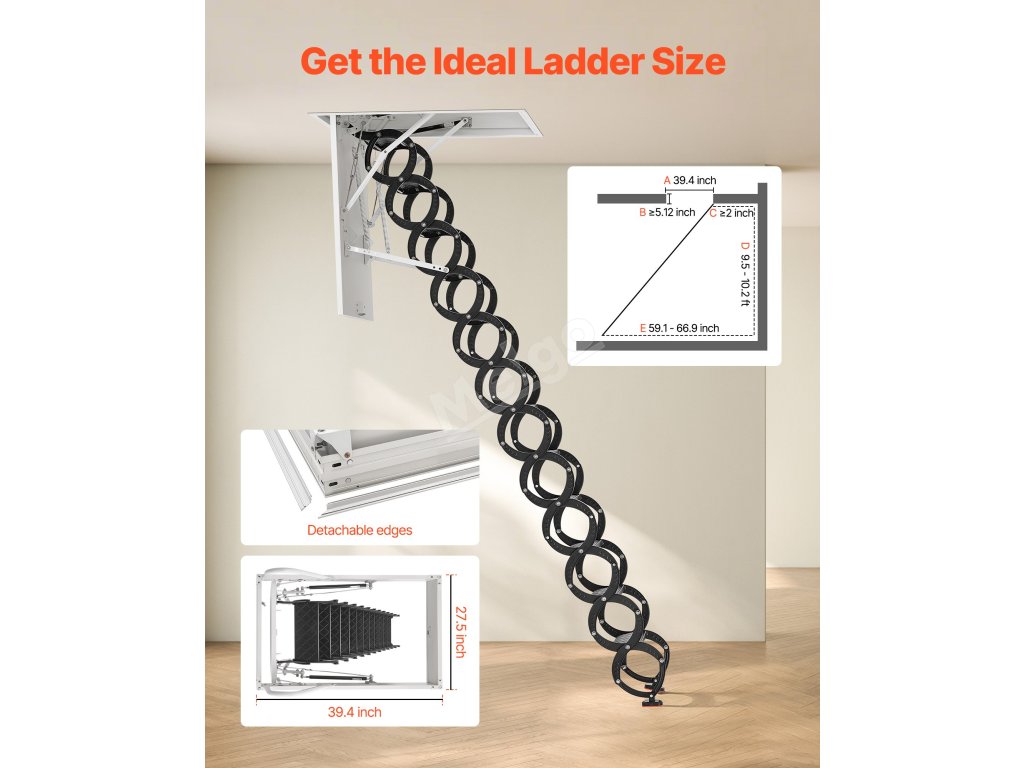 Půdní schody jsou vhodné pro stropy o tloušťce 9,5 až 10,2 stop s tloušťkou ≥5,12 palce a roztečí stěn 2 palce. Rám z oceli X-alloy, závěsy a nosné tyče udrží 660 kg s 5,5" stupni, protiskluzovými nožičkami, dvojitými hydraulickými tyčemi pro snadné použití. Součástí je tažná tyč, kroužek, magnetické dveře. Pro snadné skladování se skládá na 38,6 × 27,2 × 17,3 palce.