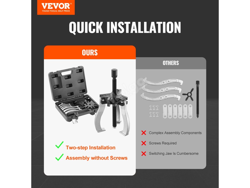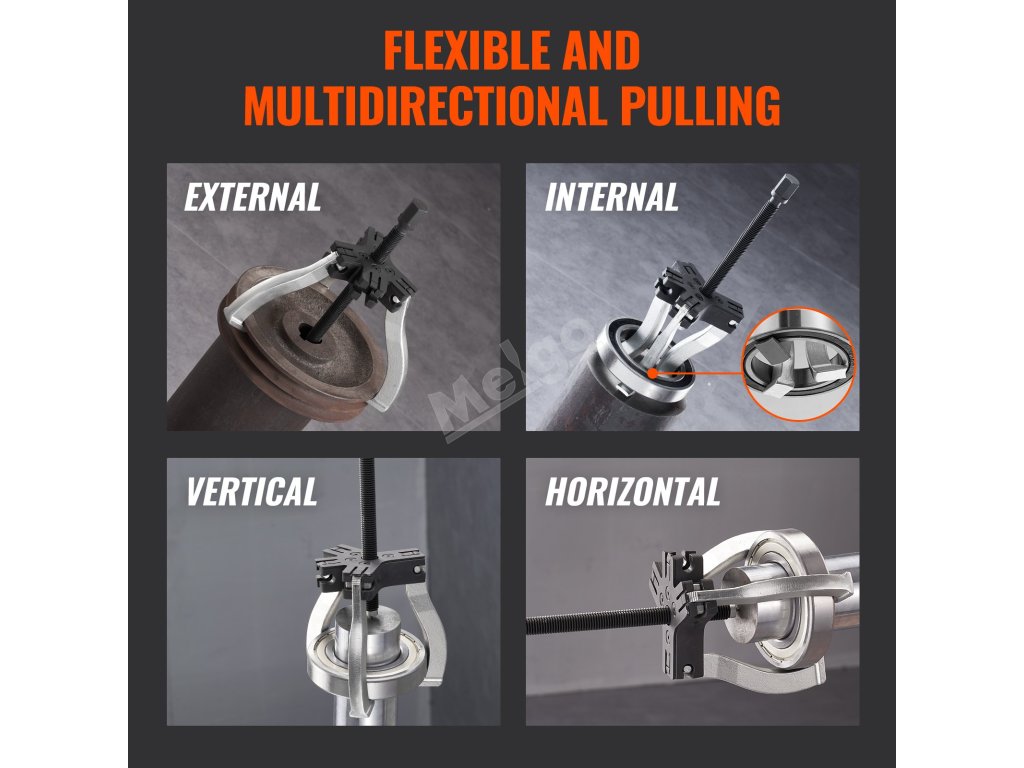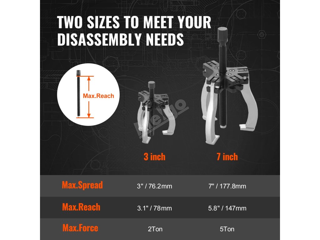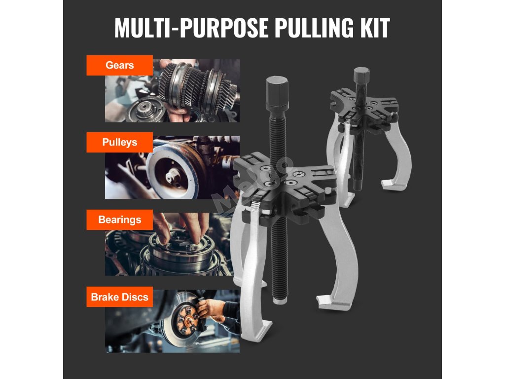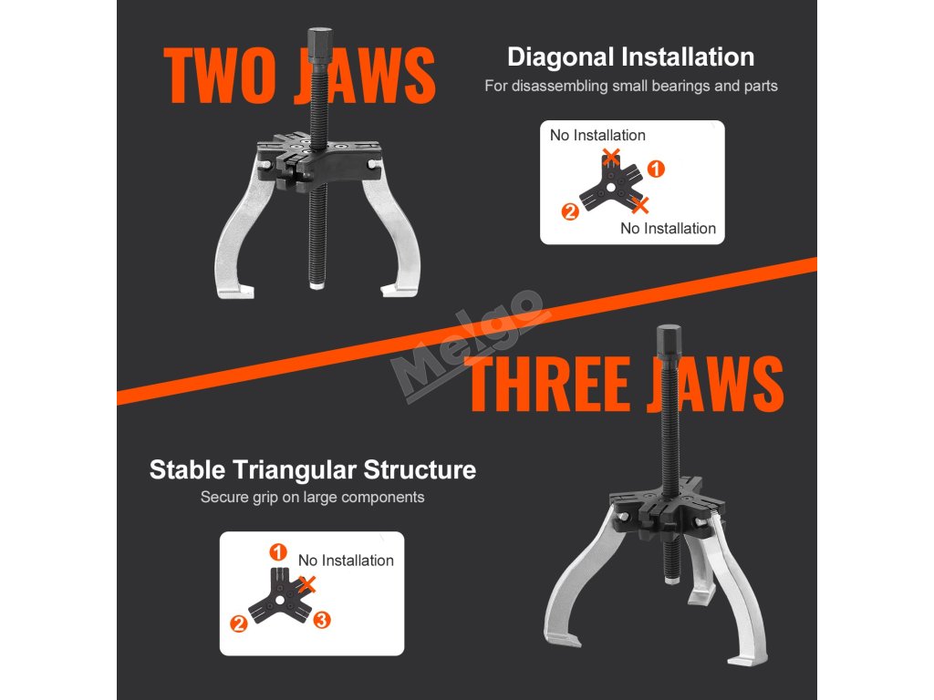 Sada stahováků ozubených kol se 2 stahováky (3", 7"). Jeho flexibilní přestavba čelistí umožňuje rychlé přepínání mezi dvou- a tříčelisťovým režimem, čímž se zvyšuje tažná síla a stabilita. Jeho oboustranná konstrukce čelistí zajišťuje bezpečné uchopení malých i velkých dílů.