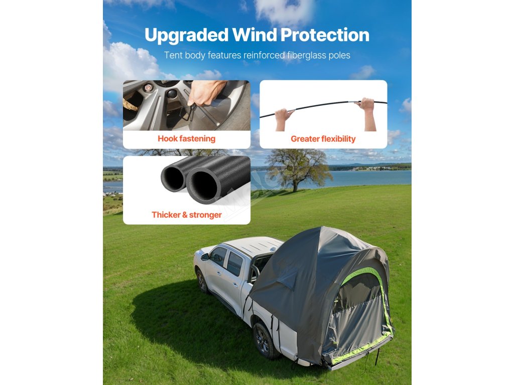 Stan na lůžko pro nákladní automobily je vyroben z odolné tkaniny 210D Oxford s pevným prošitím a vodotěsnou úpravou PU2000, která pomáhá blokovat teplo a zároveň chrání před deštěm, čímž zajišťuje suchý a pohodlný prostor uvnitř.