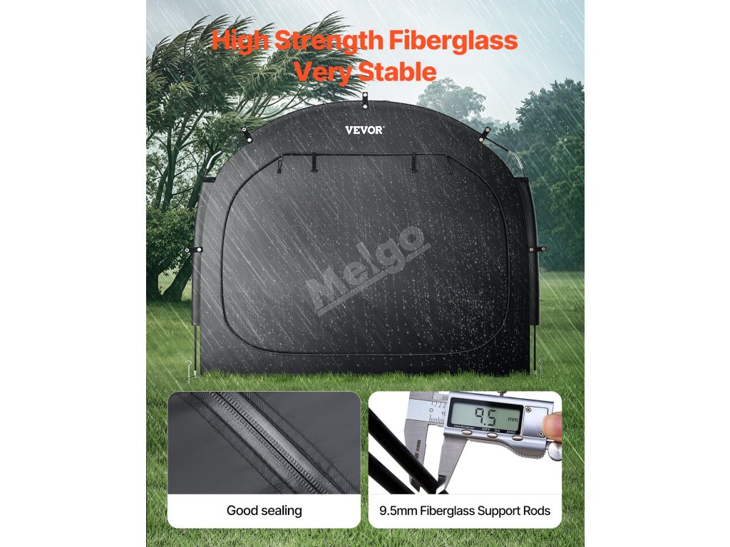 Náš přístřešek na kolo je opatřen dvouvrstvou nepromokavou vrstvou a tkaninou Oxford 210D se stříbrnou vrstvou, která zajišťuje odolnost. Robustní rám ze skelných vláken zajišťuje stabilitu, zatímco jeho lehká konstrukce umožňuje rychlé sestavení. Větrací okénka udržují interiér v suchu a svěžesti.