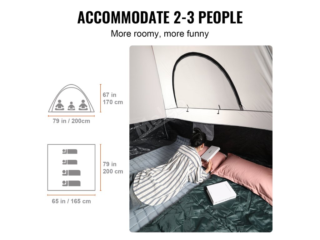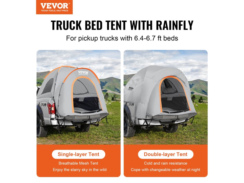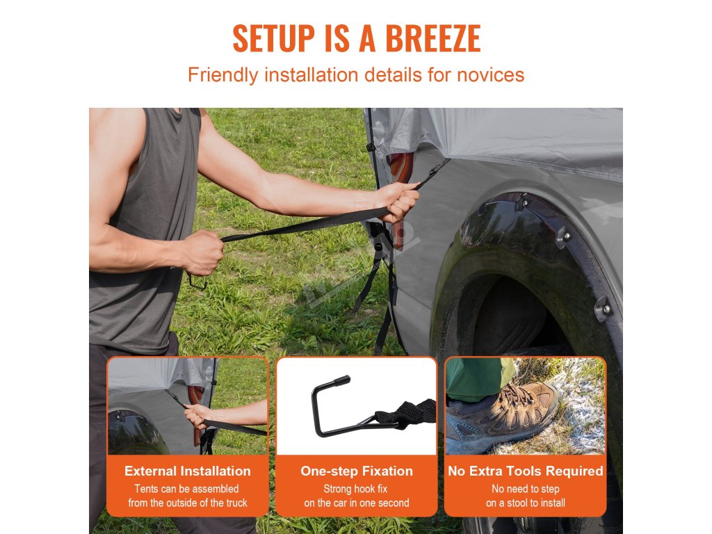 Náš stan VEVOR Truck Bed je špeciálne vyrobený pre pickupy. V priebehu niekoľkých minút premení vaše vozidlo na pohodlný prístrešok. Vďaka vnútornému priestoru s rozmermi 79 x 65 x 67 palcov je v ňom dostatok miesta pre dve až tri osoby. To zaručuje útulný a bezpečný spánok. Stan sa veľmi ľahko stavia. Môžete ho postaviť už za 5 minút, takže je ideálny na rýchle výlety alebo nečakané dobrodružstvá.