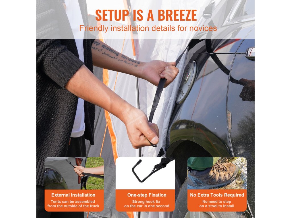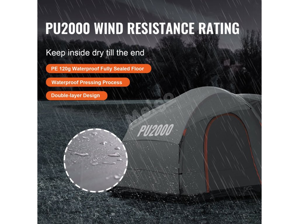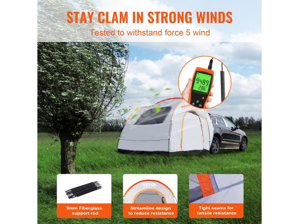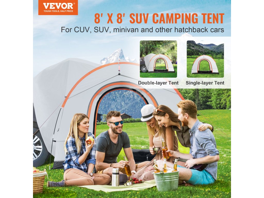 Pozdvihnite svoj zážitok z kempovania s kempingovým stanom SUV VEVOR. Ponúka všestranné použitie s rôznymi vozidlami, pričom sa doň zmestí 6 až 8 osôb. Poskytuje silnú ochranu pred nepriaznivým počasím. Konštrukcia má dve vrstvy. Má odolnosť voči vode PU2000. Tyče zo sklených vlákien sú robustné a odolné voči korózii, čo zaručuje stabilitu. Tento stan pre nákladné vozidlá je silnou a spoľahlivou voľbou, ktorá zlepší vaše kempovanie bez ohľadu na to, kam idete. Je skonštruovaný pre rodiny, priateľov a ľudí, ktorí radi kempujú sami.