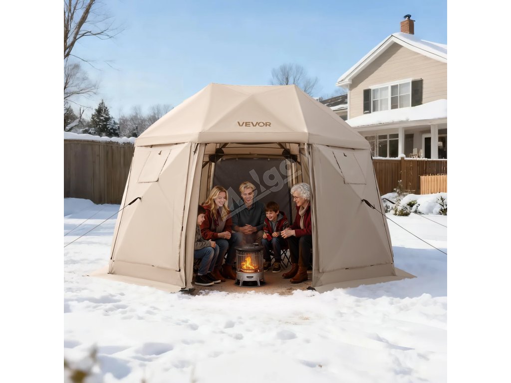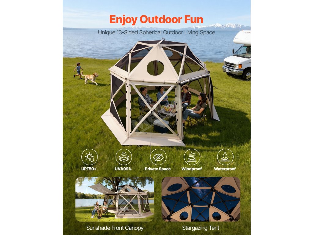 Tento kempinkový stan s altánem nabízí dostatek prostoru pro aktivity ve stínu při venkovních setkáních rodiny a přátel. Velký stan s altánem a stíněním o rozměrech 12 × 12 stop pojme 8 až 10 osob. 4 stop dlouhá 7vrstvá stříška zajišťuje pohodlnou výšku stání.
