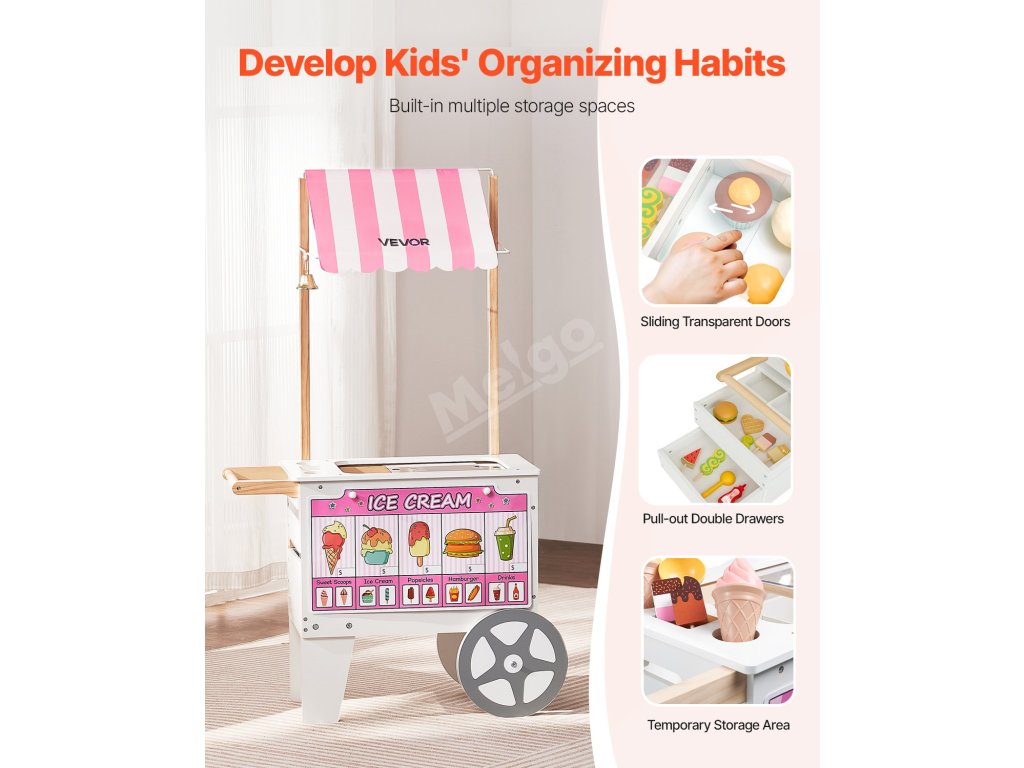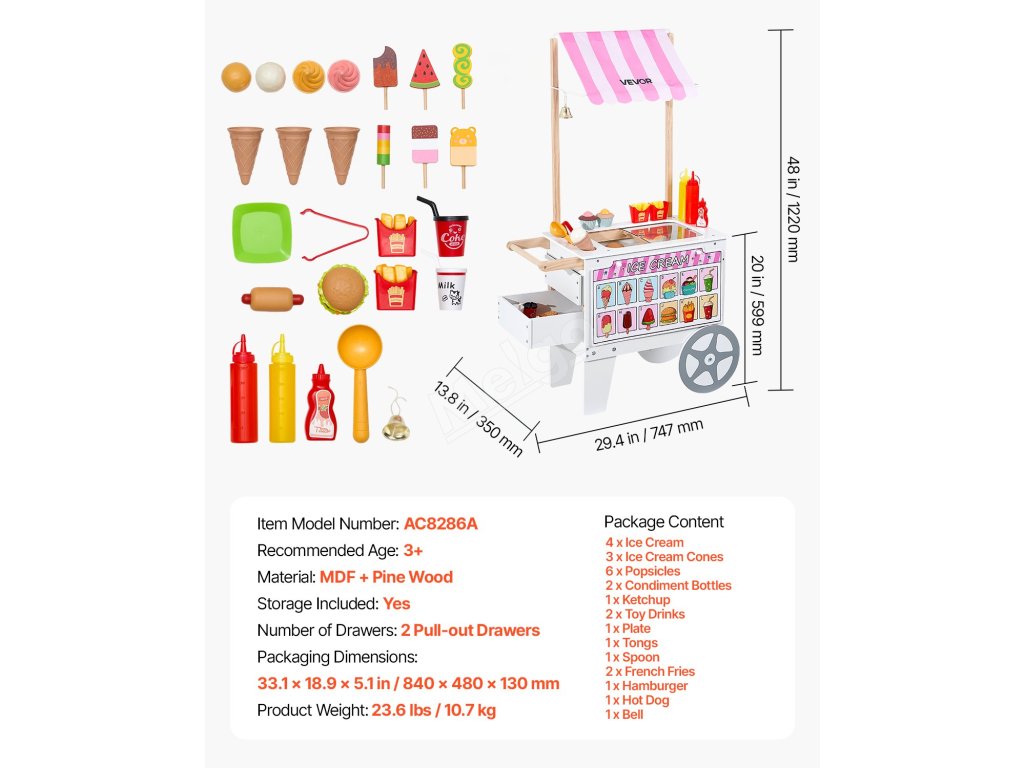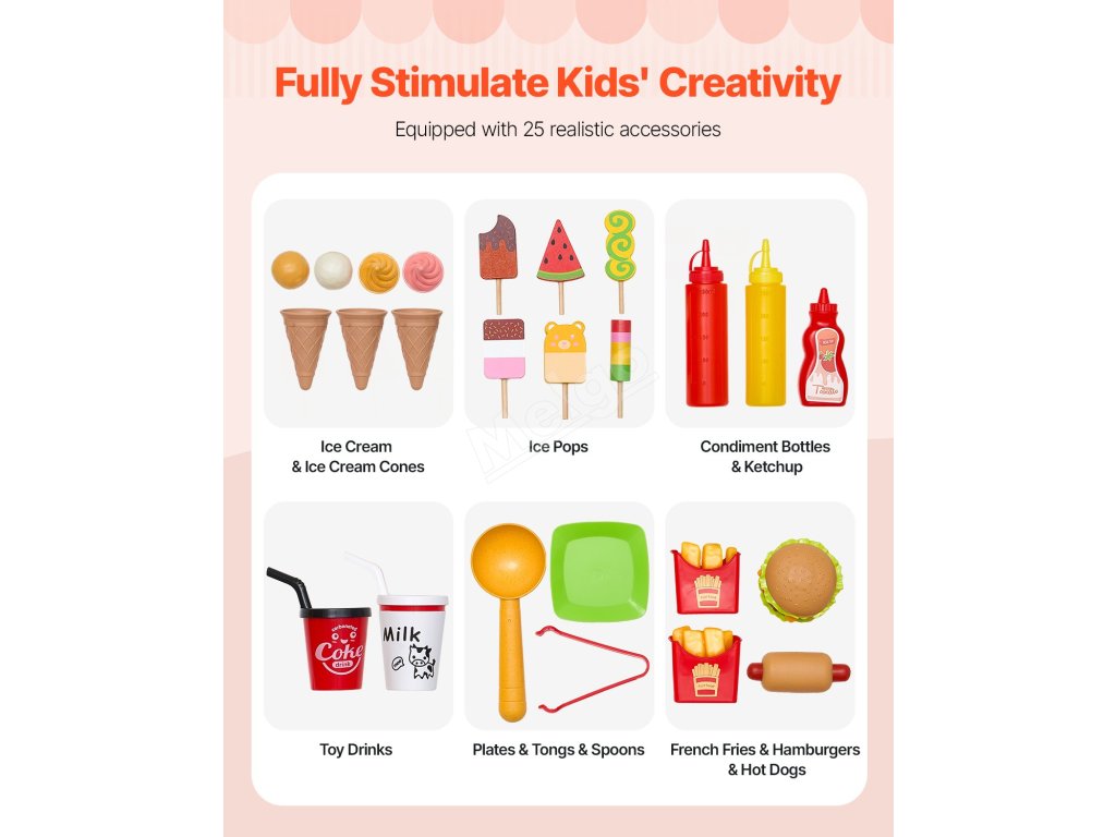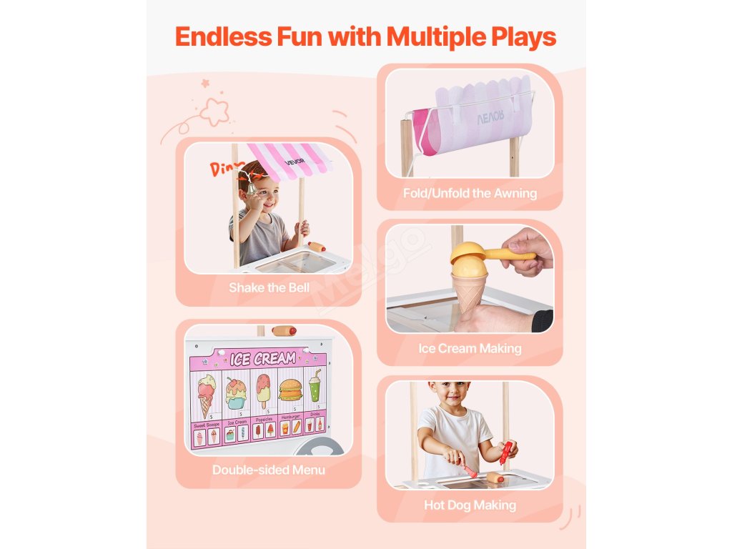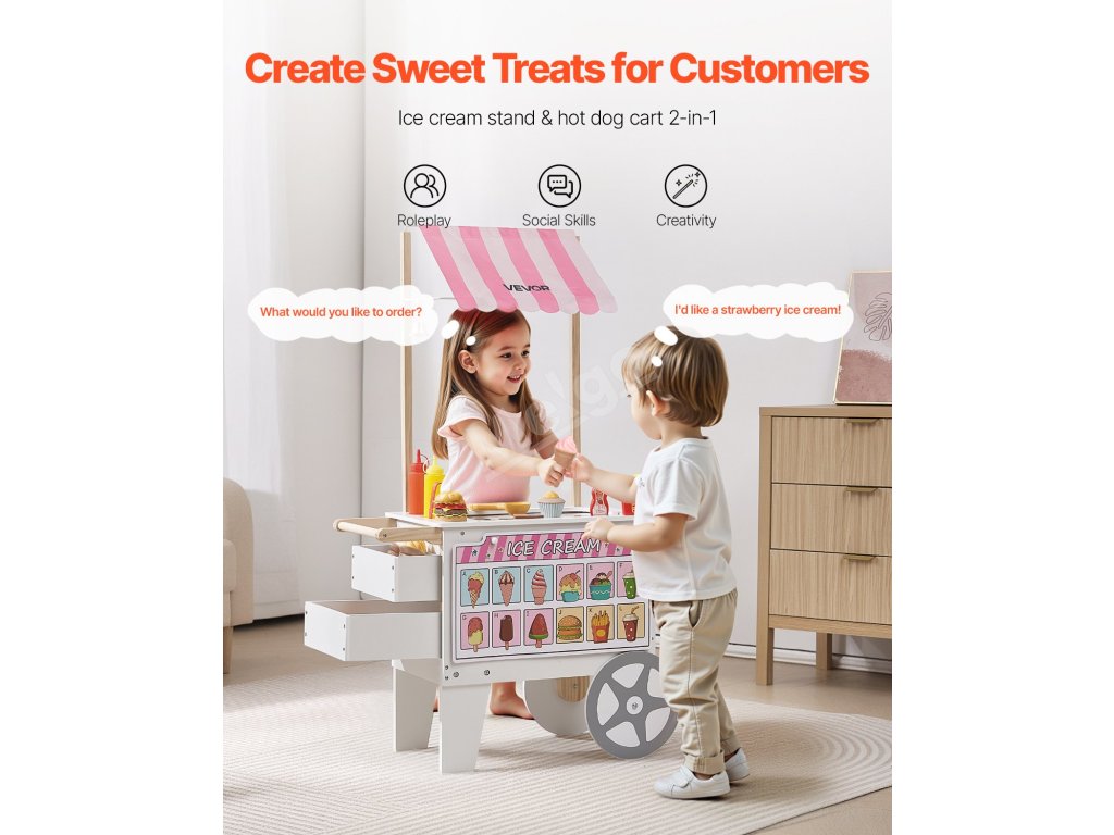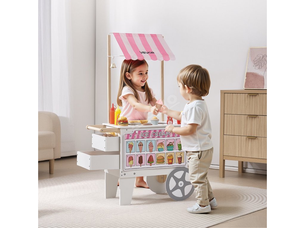 Dvojnásobná zábava! Tento dětský zmrzlinářský vůz kombinuje zmrzlinářský vůz a vozík na hot dogy, takže děti mohou předstírat, že řídí oba. Se všemi zábavnými doplňky si mohou vytvořit vlastní potravinové impérium. Popusťte uzdu své fantazii!