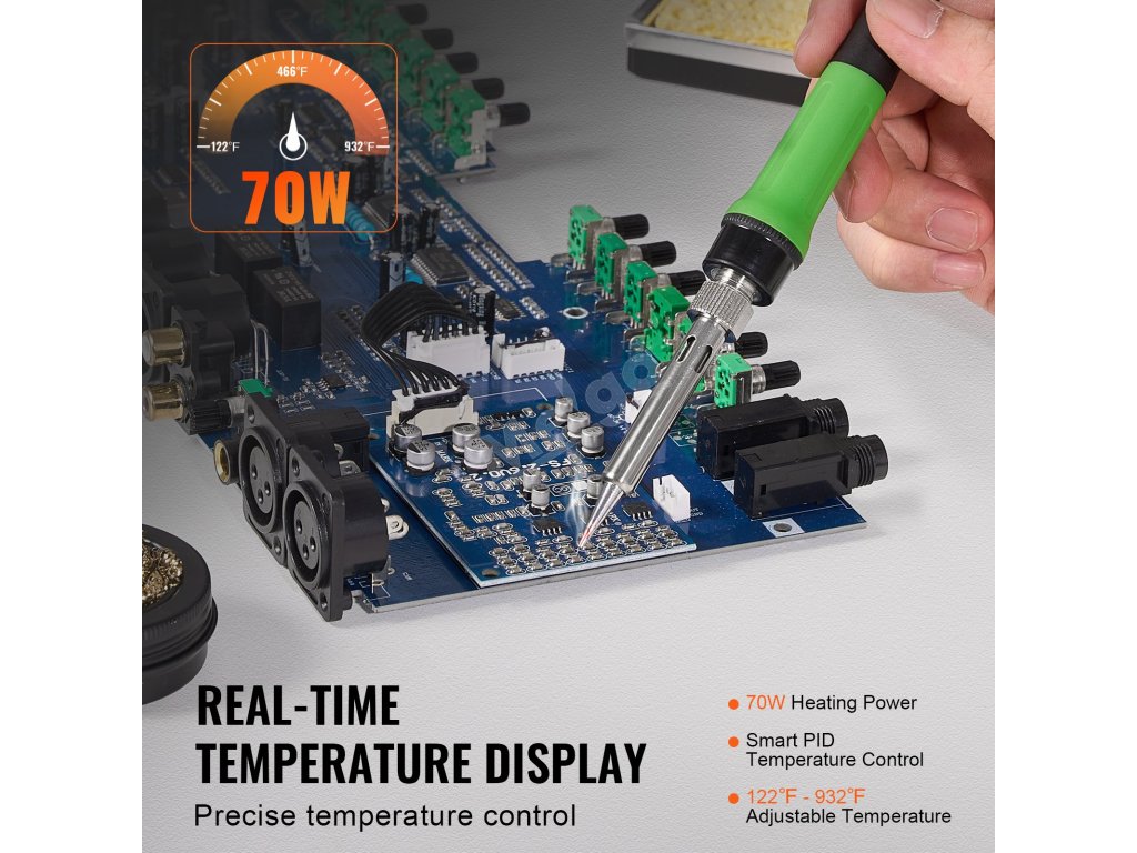 Inteligentná regulácia teploty pre rýchlejšie a presnejšie zahrievanie! Vďaka vysokému výkonu 70 W, regulácii teploty PID a nastaviteľnej teplote 122℉-932℉ táto spájkovacia stanica zabezpečuje efektívne spájkovanie, ideálne na opravy dosiek plošných spojov, opravy šperkov, projekty pre domácich majstrov atď.