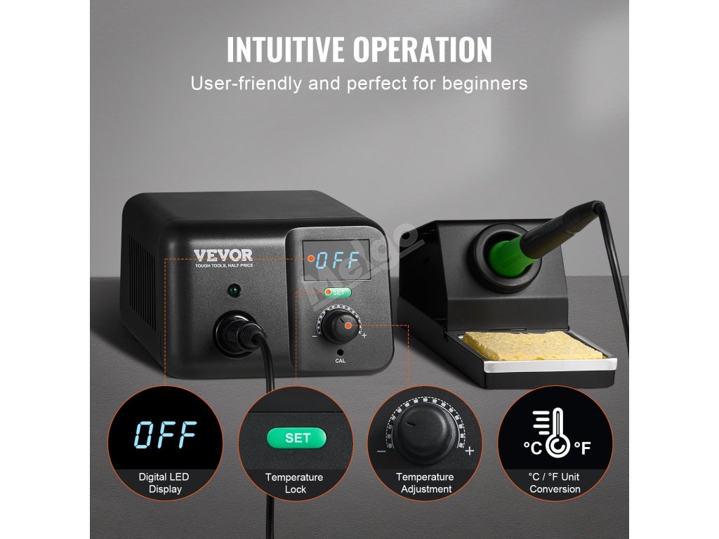 Táto digitálna spájkovacia stanica je vybavená ľahko použiteľným gombíkom na nastavenie teploty a prehľadným LED displejom na jednoduché sledovanie. Je vybavená funkciou uzamknutia teploty, kalibráciou a prevodom ℃/℉ a je navrhnutá tak, aby spĺňala rôzne potreby.