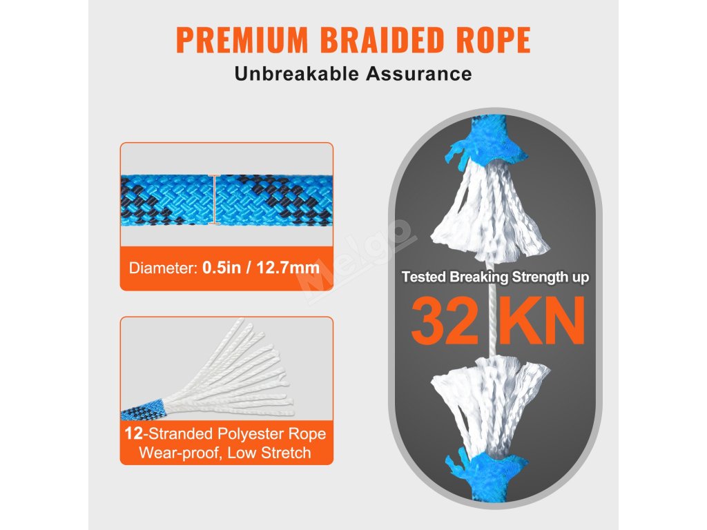 Vnitřní jádro je vyrobeno z extrémně pevné polyesterové příze, která zajišťuje vysokou pevnost v tahu. Vnější plášť je pevně utkán ze zesílené polyesterové příze, která je odolnější proti opotřebení. Technologie řezání za tepla účinně zabraňuje rozpadu lana.