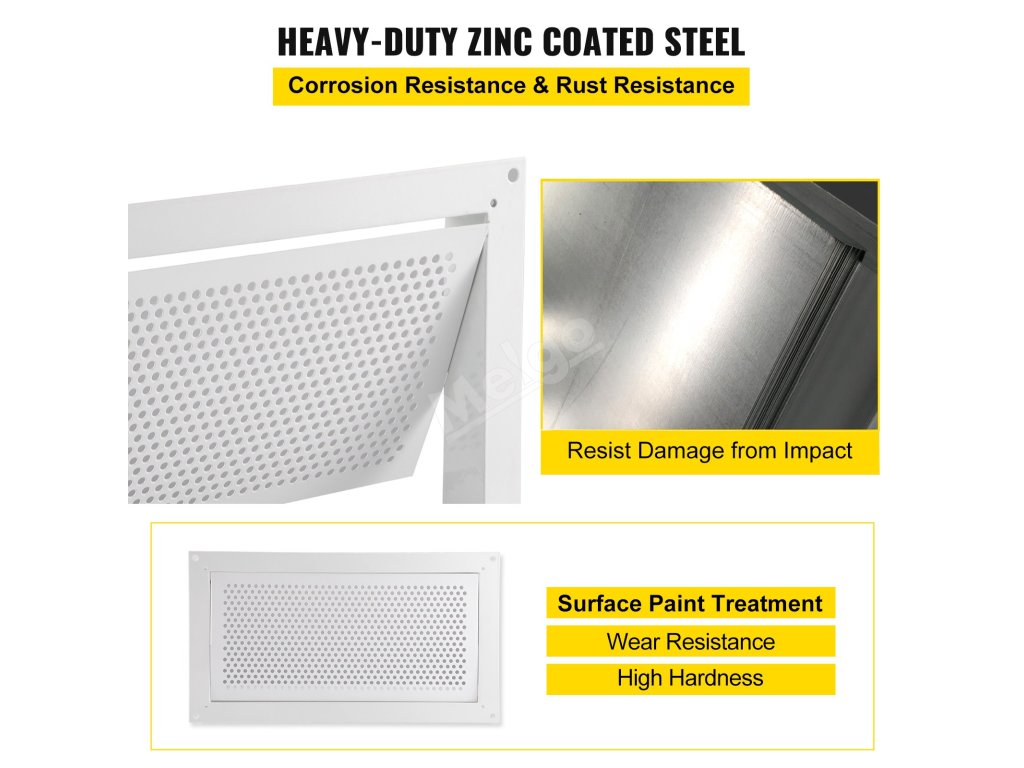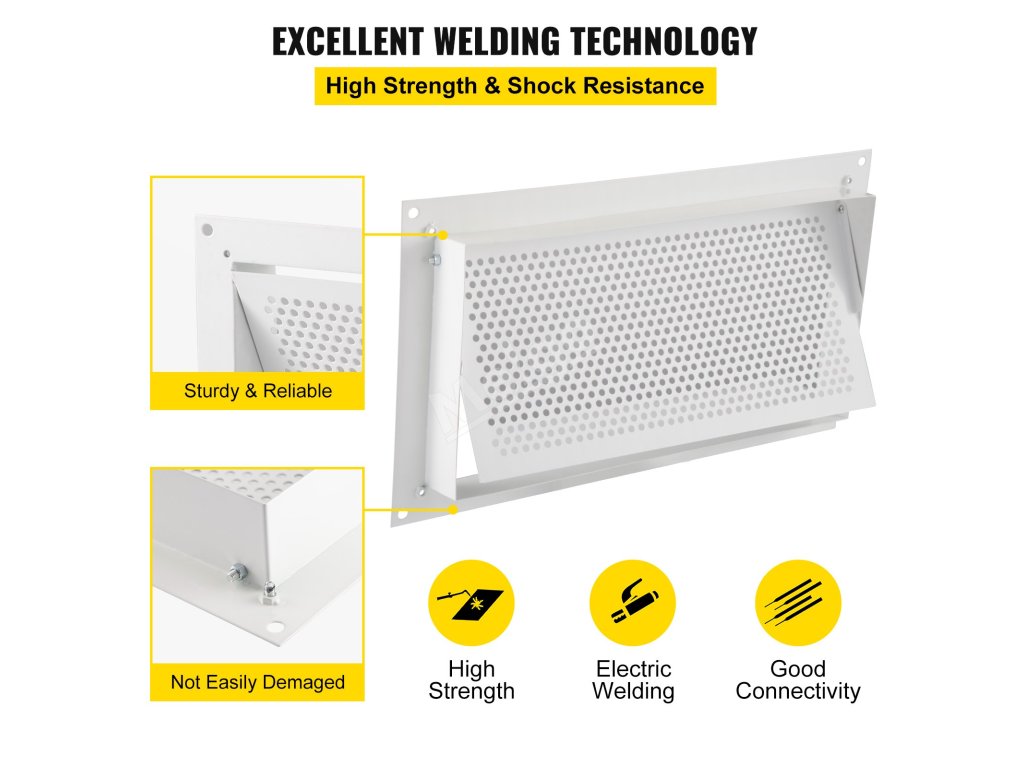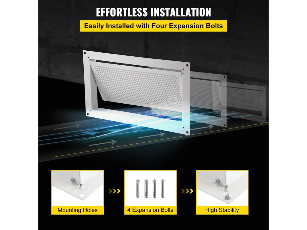 Jednoduchý proces inštalácie eliminuje potrebu špecializovaných nástrojov. Ušetrí vám čas a peniaze tým, že si nemusíte najímať odborníka. Protipovodňový vetrací systém VEVOR je navrhnutý na jednoduchú inštaláciu, vďaka ktorej ho môže nastaviť každý. Dodáva sa so štyrmi montážnymi otvormi a sadou montážnych skrutiek, čím sa eliminuje potreba dokupovať čokoľvek ďalšie. Tieto skrutky presne zapadajú do vetracieho otvoru, čím sa zabezpečí, že zostane bezpečný aj po inštalácii.