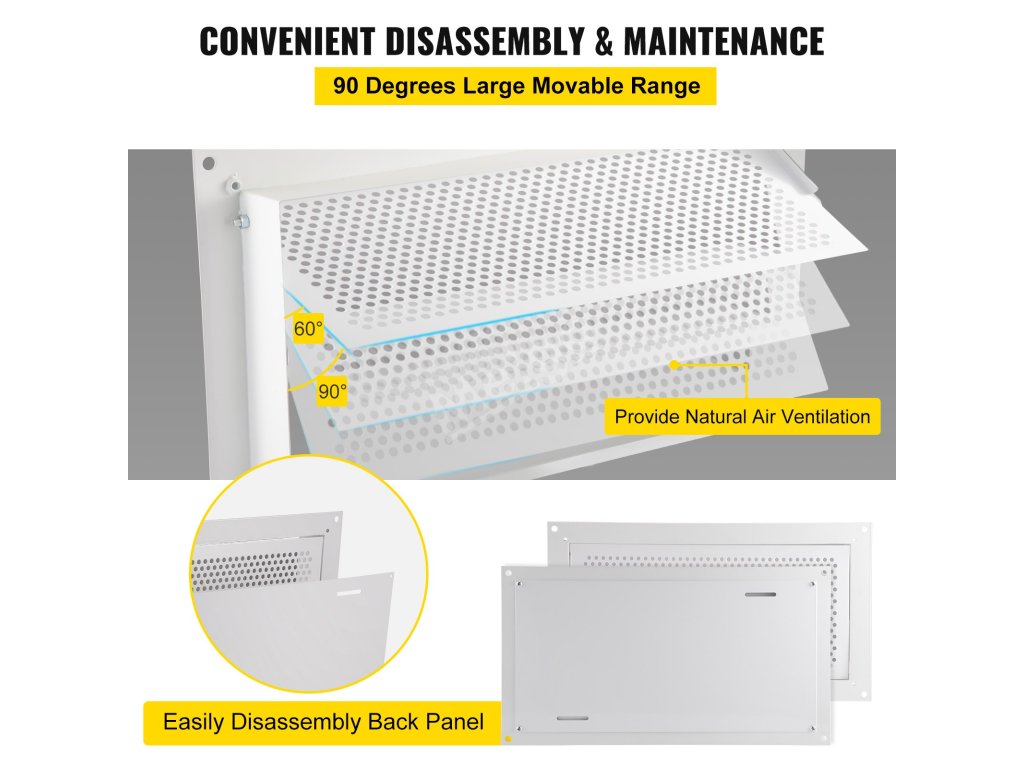 Bežné vetracie otvory sa môžu deformovať v dôsledku nedostatočnej údržby. Proces údržby takýchto vetracích otvorov je veľmi zložitý. Protipovodňový ventilátor VEVOR je navrhnutý tak, aby sa ľahko udržiaval, čo z neho robí skvelú voľbu na ochranu vášho majetku. Jeho zadný panel možno ľahko rozobrať, čo vám umožní prístup k vnútorným častiam a ich čistenie bez akýchkoľvek ťažkostí. Povrch siete sa môže pohybovať až o 90 stupňov, čo uľahčuje vetranie a udržiavanie vetracieho otvoru v čistote.