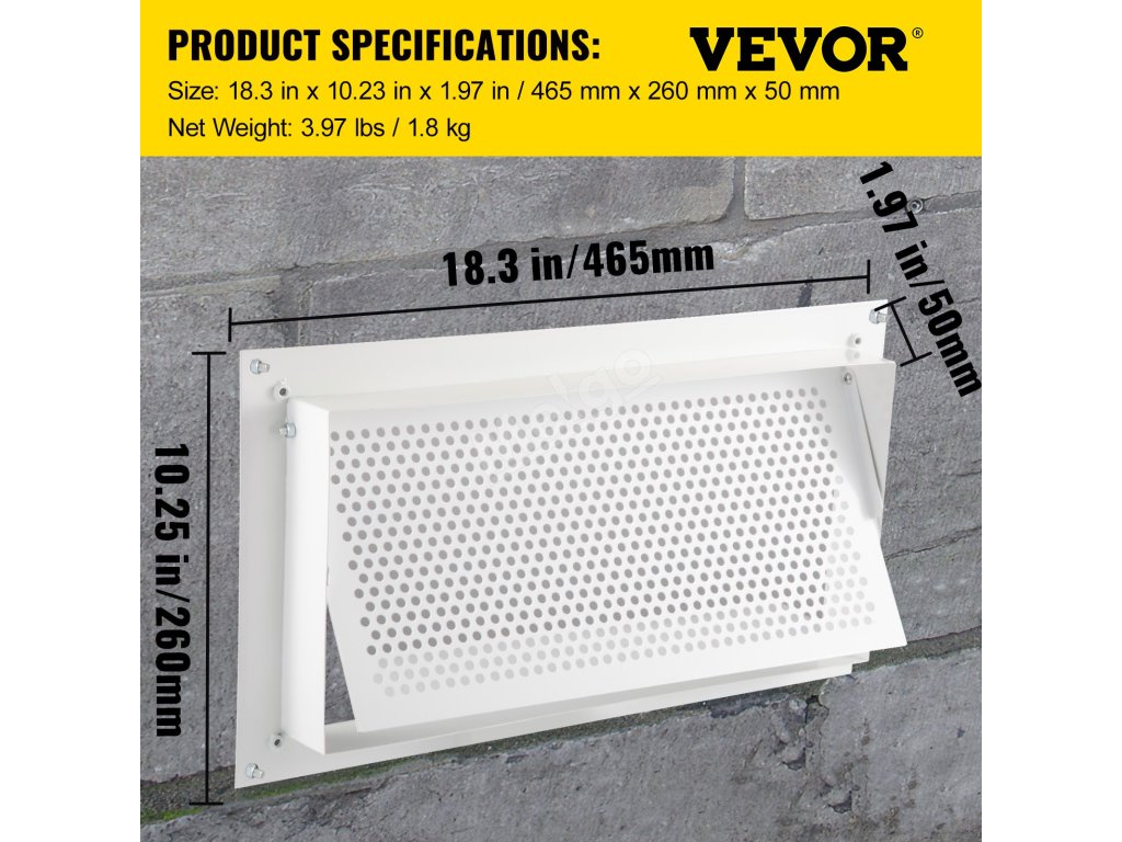 Protipovodňový ventilátor 8x16 je navrhnutý tak, aby sa dobre zmestil do vášho priestoru. Rozmery otvoru sú 16 x 8 palcov a celková veľkosť je 18,3 x 10,23 x 1,97 palca. Vďaka týmto rozmerom je ideálny na správne vetranie a ochranu. S týmto vetracím otvorom môžete zabezpečiť dobré vetranie a bezpečnosť vášho priestoru v plazivom priestore.