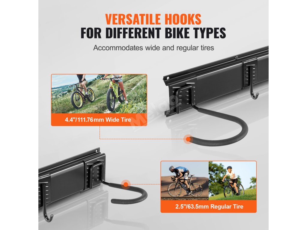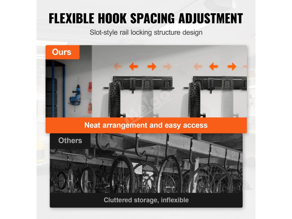 Díky praktickému systému drážek a posuvníků našeho nástěnného nosiče kol můžete háčky snadno přemístit a přizpůsobit je tak různým rámům kol.