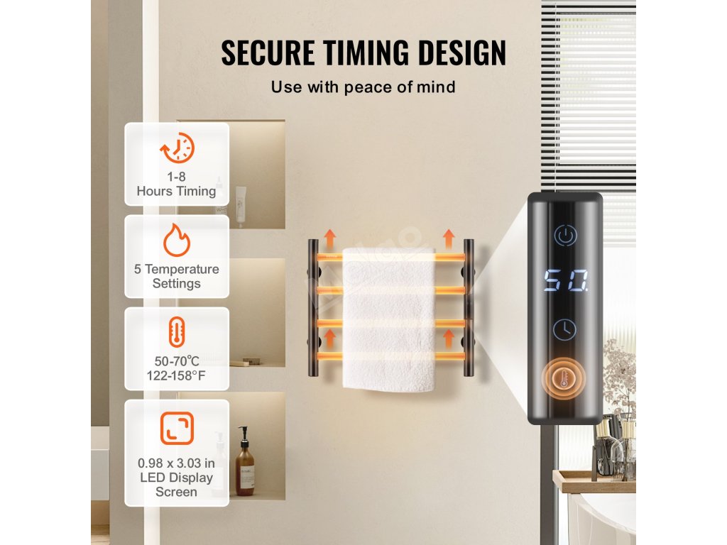 Elektrický ohřívač ručníků je vybaven digitálním časovačem a umožňuje nastavit automatické zapnutí a vypnutí, takže je vhodný, když nejste v místnosti.