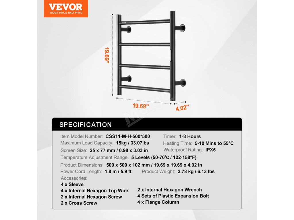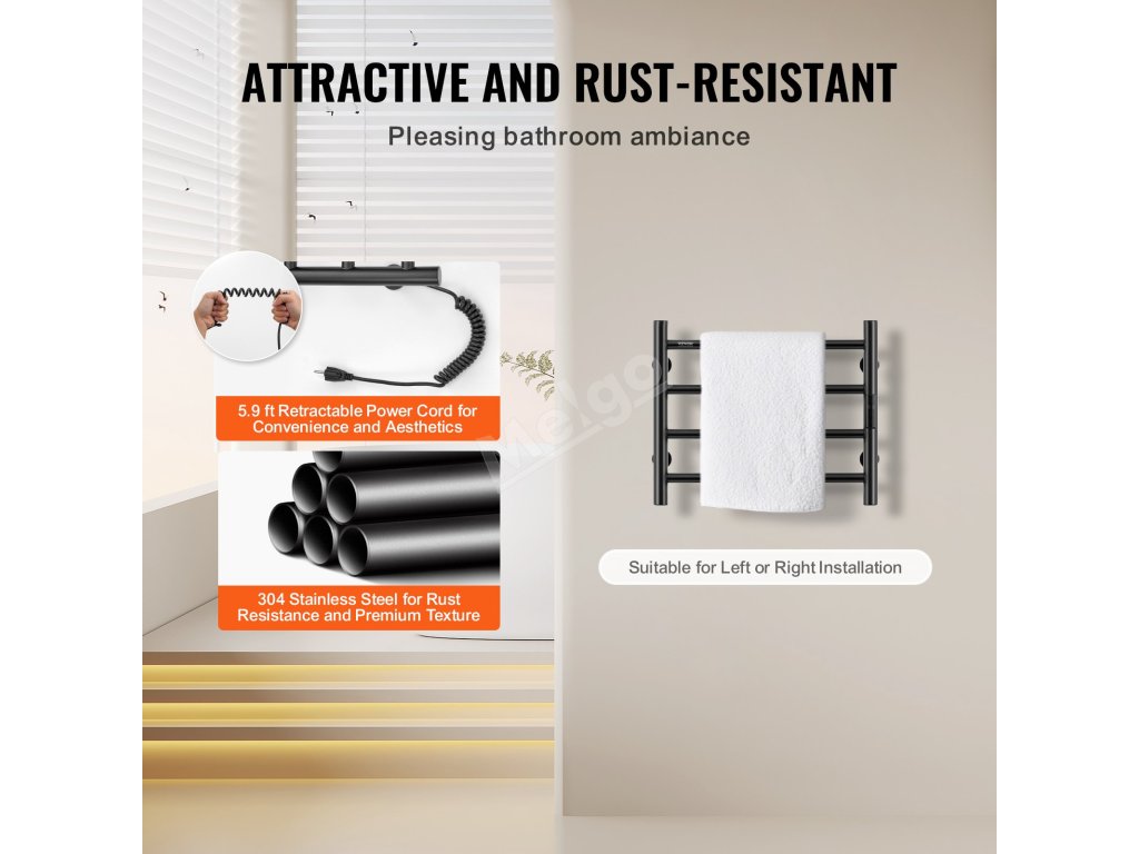 Ohřívač ručníků je vyroben z nerezové oceli, má robustní rám a vodotěsnost IPX5, což zaručuje vynikající výkon.