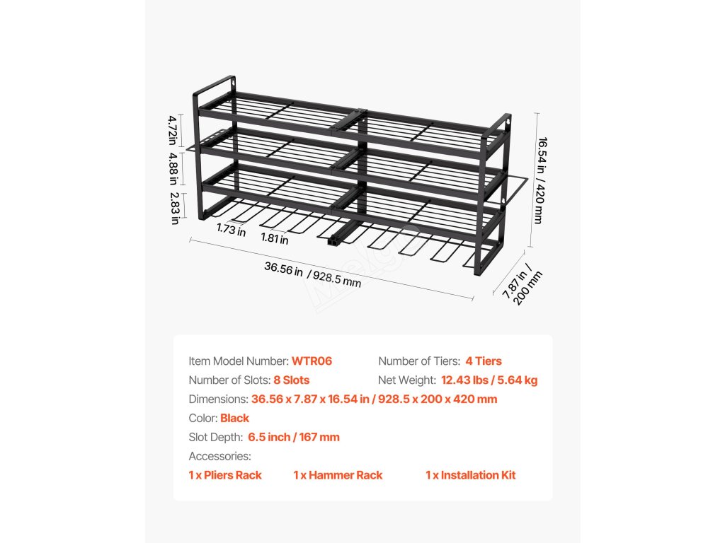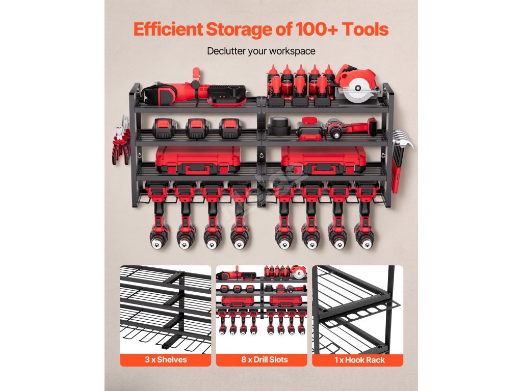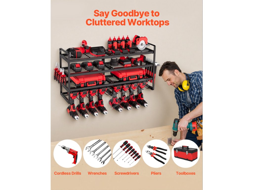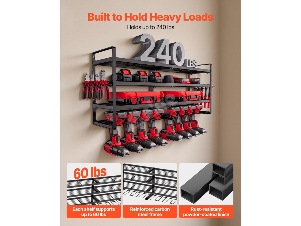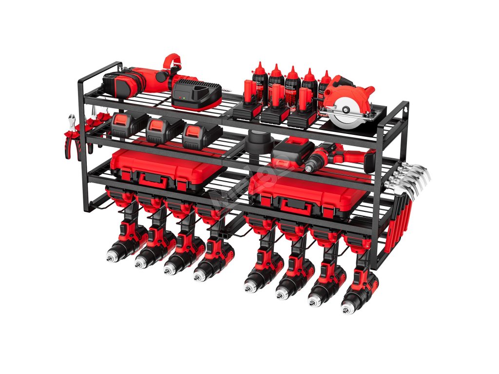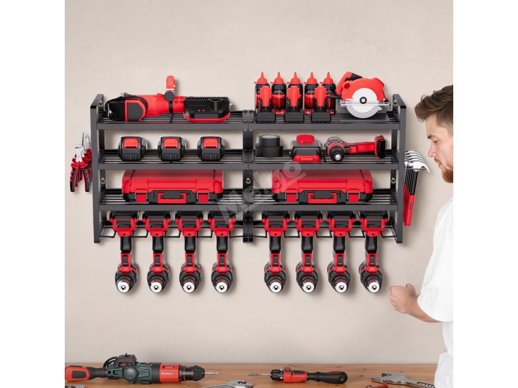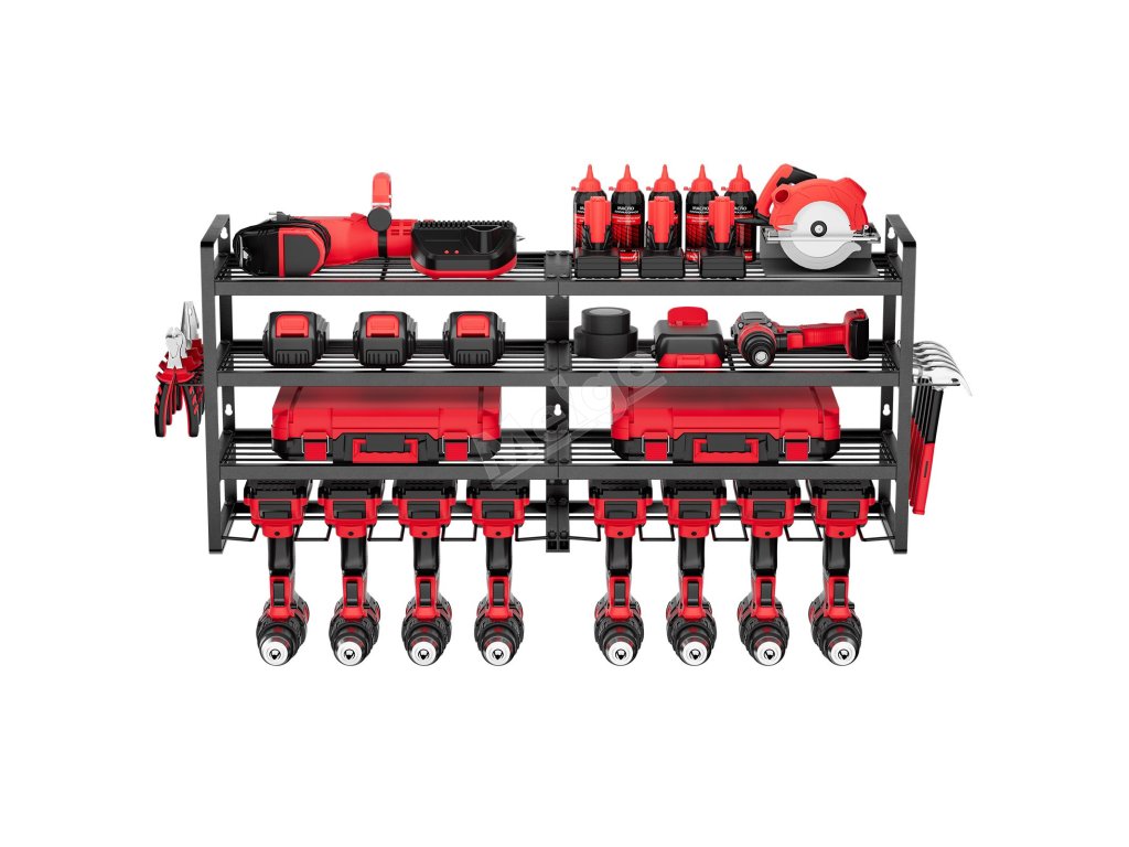 Tento nástěnný čtyřpatrový organizér na elektrické nářadí nabízí rychlý přístup k nářadí. Jeho robustní rám z uhlíkové oceli unese až 240 kg, takže do něj snadno uložíte vrtačky, skříňky s nářadím a další nářadí a získáte uklizený pracovní prostor bez starostí.