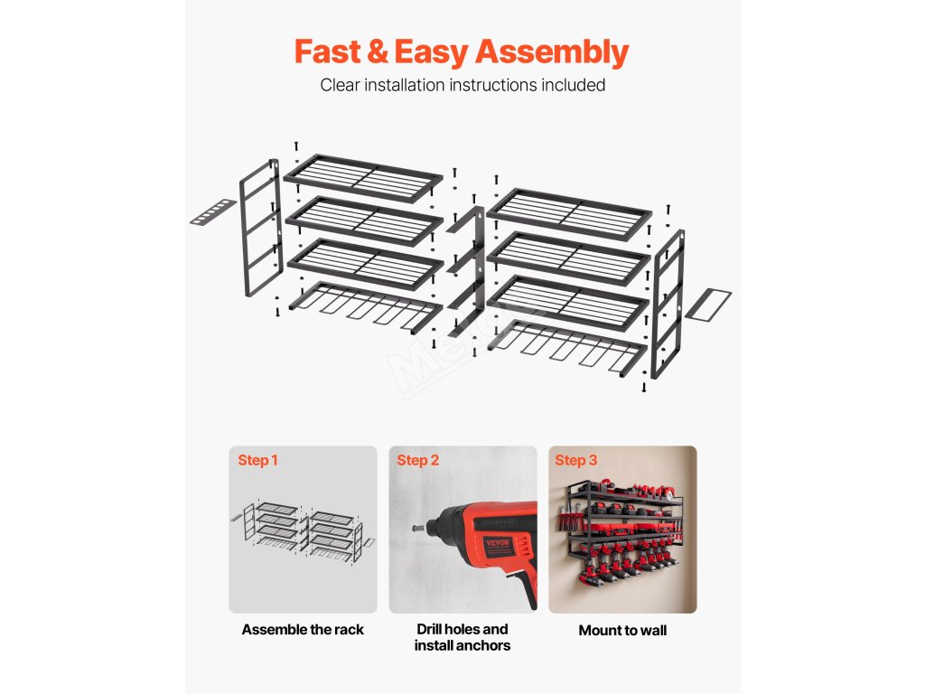 Náš organizér na vrtačku je dodáván s jasným návodem krok za krokem a veškerým potřebným hardwarem, včetně distančního šroubu pro rychlou a snadnou montáž na stěnu. Snadno jej tedy sestavíte během několika minut.